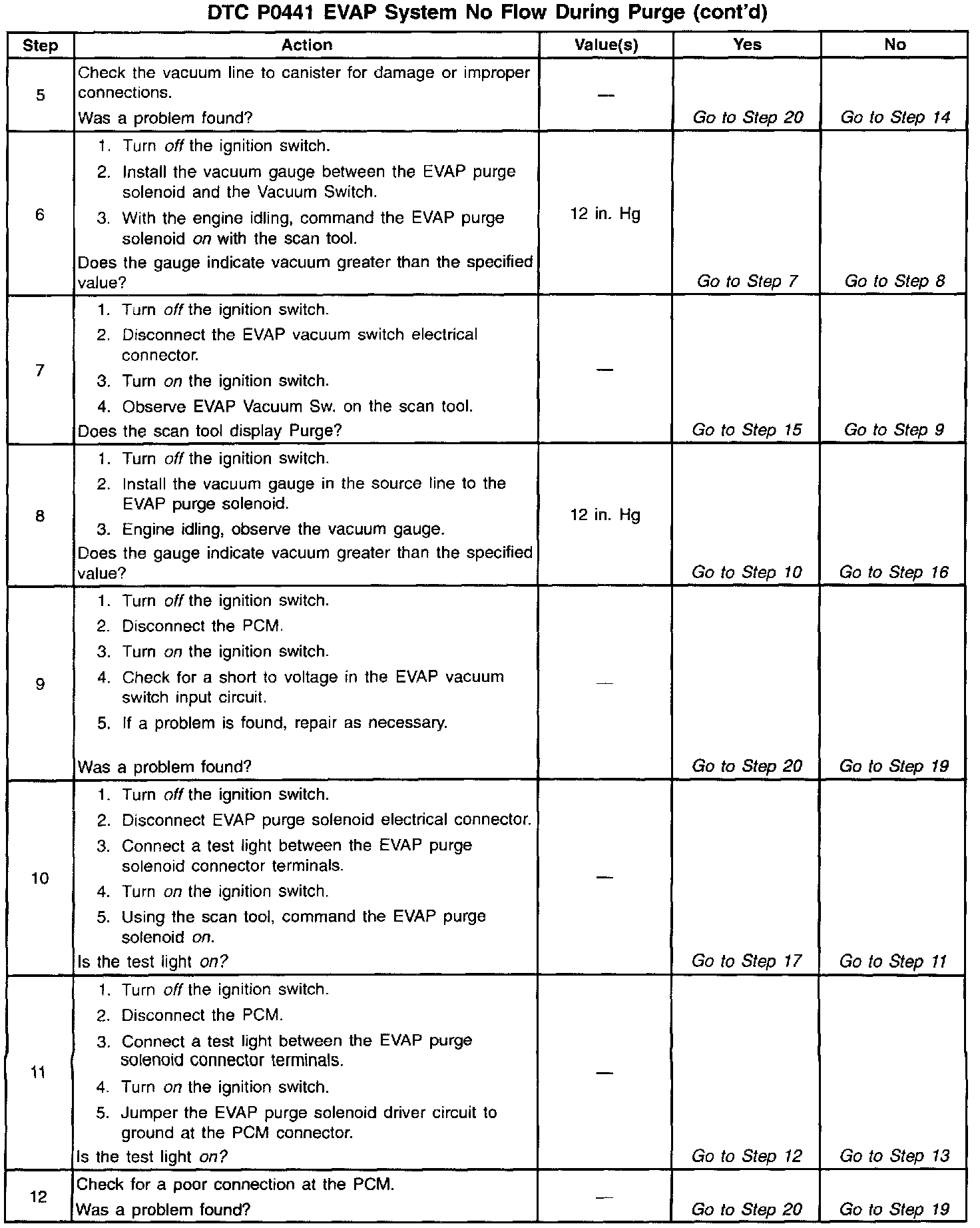 The EVAP purge vacuum switch is a normally closed switch positioned in the purge line between the canister and the EVAP purge solenoid. The EVAP purge vacuum switch will open when vacuum increases to greater than 5 inches of water in the purge line. The PCM monitors the EVAP purge vacuum switch signal to determine of the evaporative emission control system is working properly. If the switch is closed (no purge flow) when the PCM is commanding the EVAP purge solenoid ON, DTC P0441 will be set.