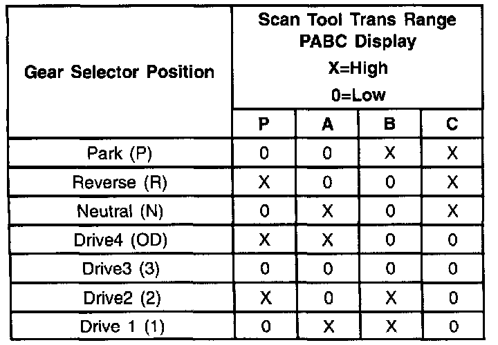 The Transaxle Range Switch is part of the Transaxle Park/Neutral Position (PNP) switch mounted on the transaxle manual shaft. The four inputs from the transaxle range switch indicate to the PCM which position is selected by the Transaxle selector lever. This information is used for ignition timing, EVAP canister purge, EGR and IAC valve operation. The combination of the four transaxle range input states determine the PCM commanded shift pattern. The input voltage level at the PCM is high (B+) when the transaxle range switch is open and low when the switch is closed to ground. The state of each input is represented on the scan tool as X=high voltage level, 0=low voltage level. The four parameters represent transaxle range switch Parity, A, B, and C inputs respectively.