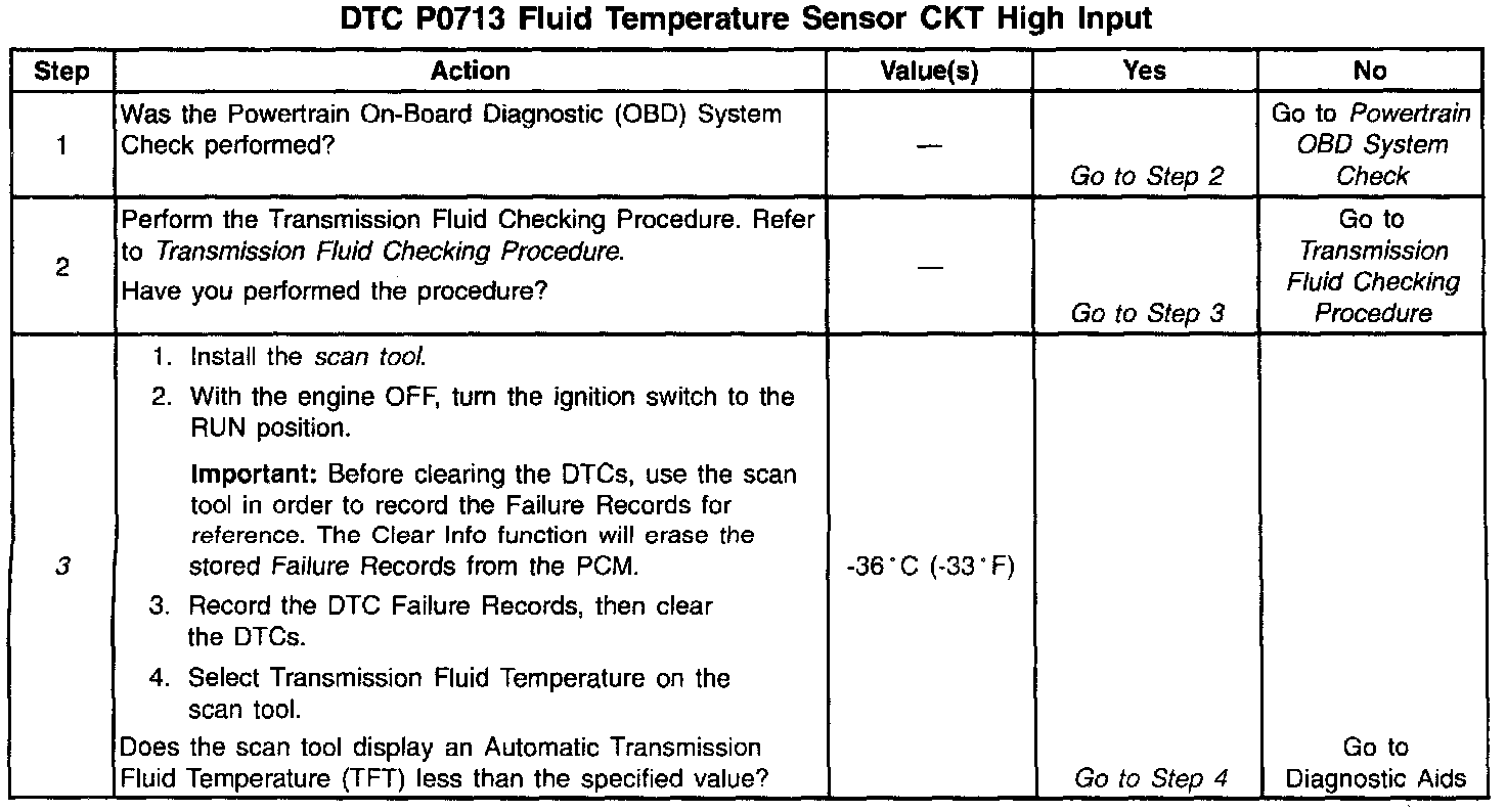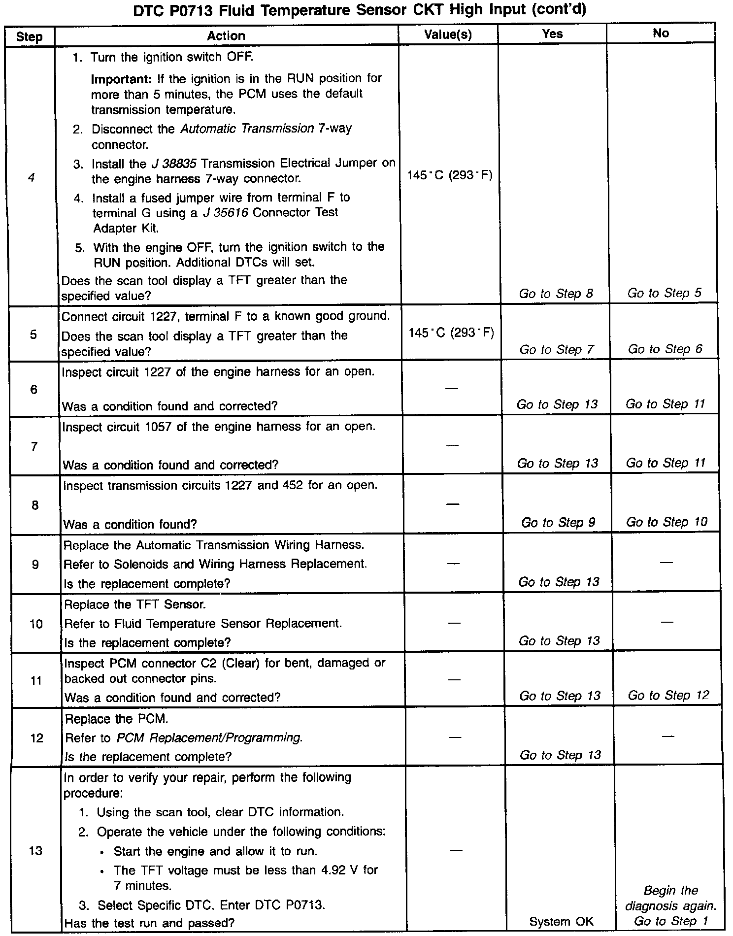 When the PCM detects a voltage input greater than 4.92 volts in the TFT Sensor circuit, indicating an open or short to power, then DTC P0713 sets. DTC P0713 is a type D DTC.