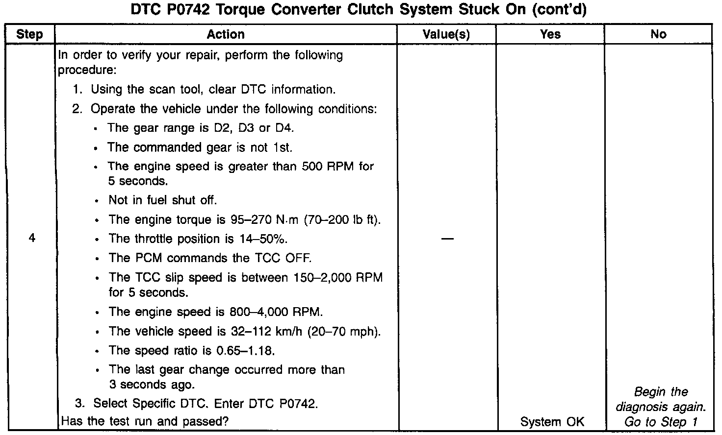 When the PCM detects 3 occurrences of TCC slip between -20 and +50 RPM for 5 seconds, indicating the TCC is applied when commanded OFF, then DTC P0742 sets. DTC P0742 is a type B DTC.