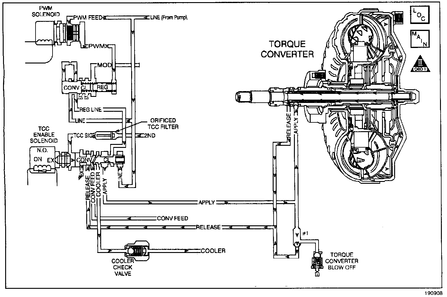The PCM energizes the Torque Converter Clutch Solenoid Valve (TCC Sol. Valve) by creating a ground path on circuit 422. When grounded (energized), the TCC Sol. Valve stops converter signal oil from exhausting. This causes converter signal oil pressure to increase and move the TCC apply valve. When the TCC Sol. Valve is de-energized, the valve will exhaust fluid and release the TCC.