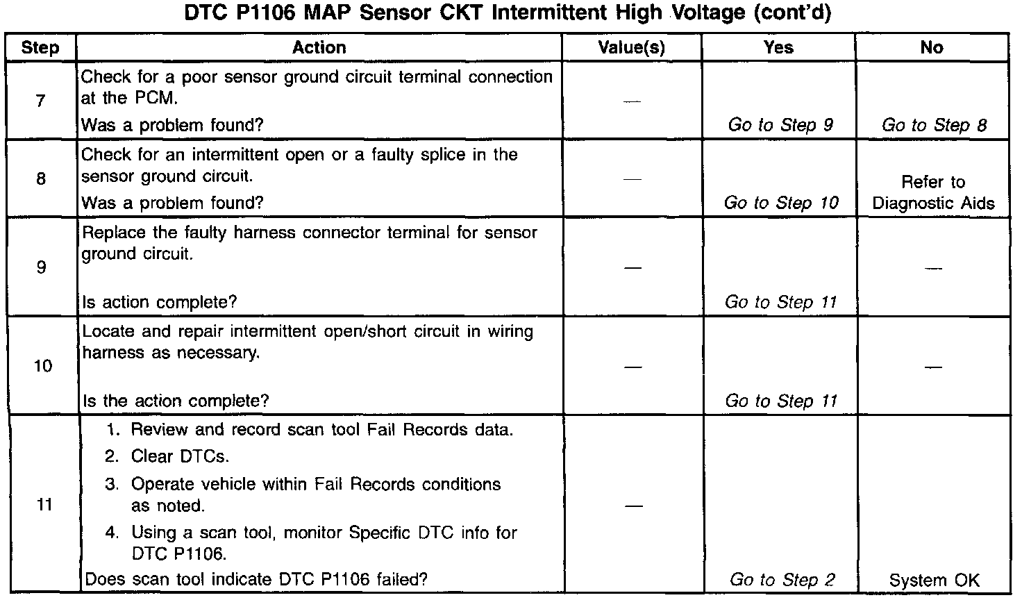 The PCM monitors the MAP signal for voltages outside the normal range of the MAP sensor. If the PCM detects a MAP signal voltage that is intermittently high, DTC P1106 will be set.