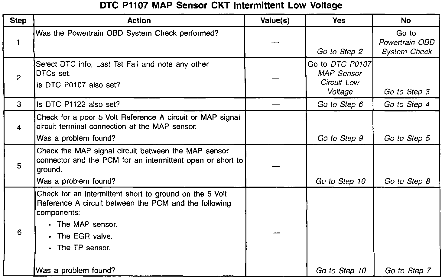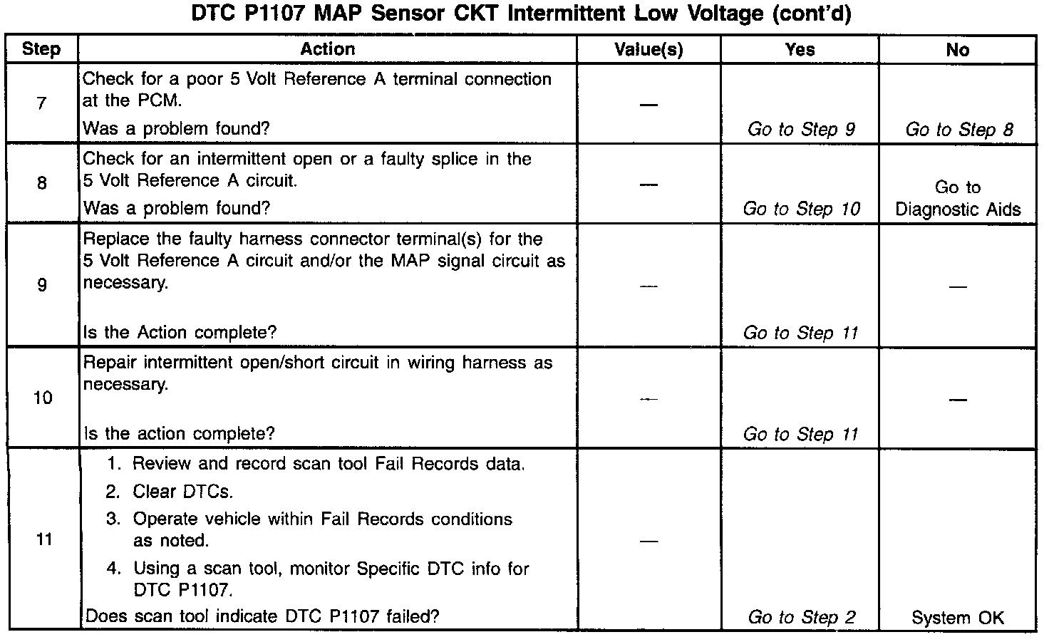 The PCM monitors the MAP signal for voltages outside the normal range of the MAP sensor. If the PCM detects a MAP signal voltage that is intermittently low, DTC P1107 will be set.