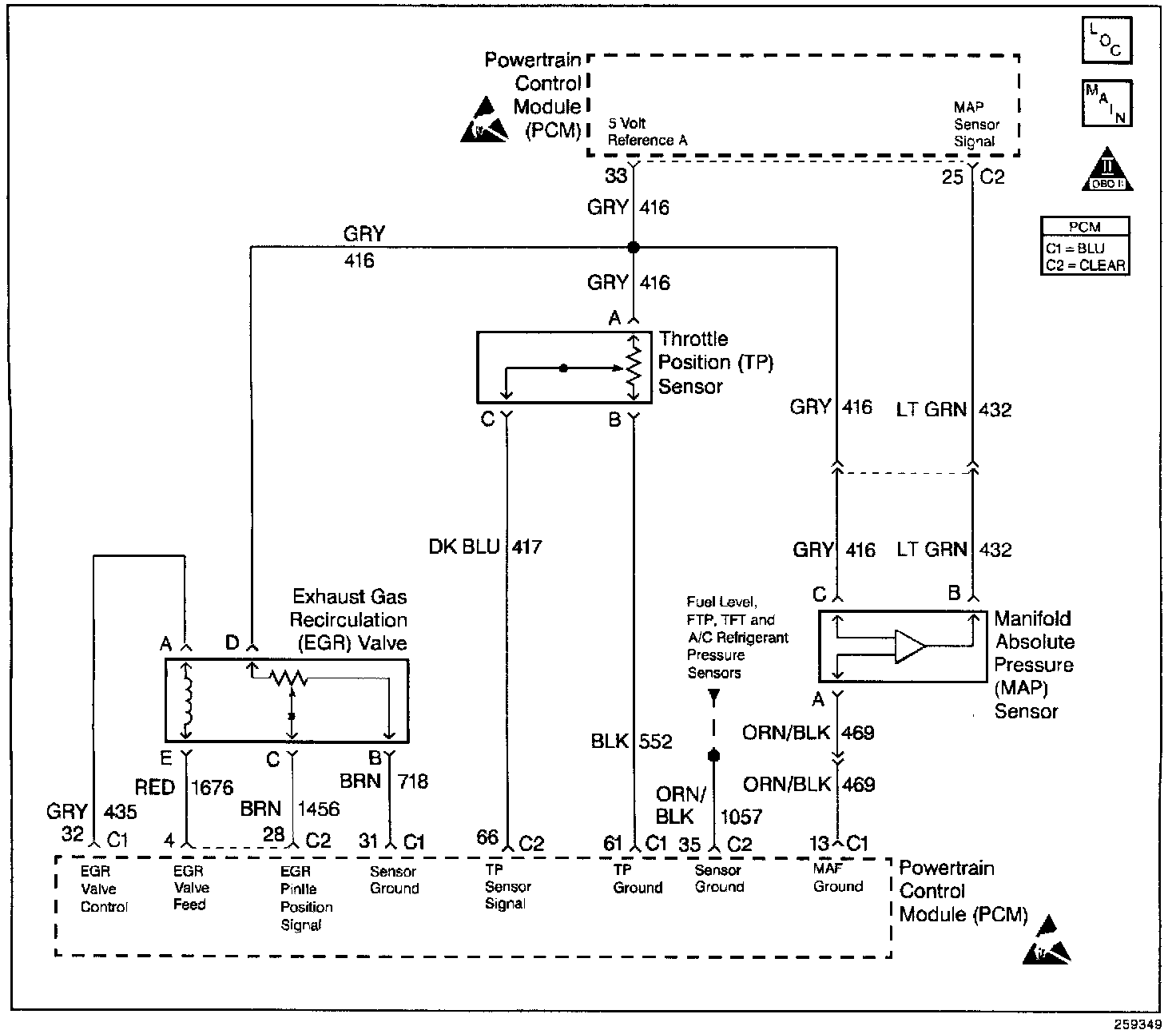 The Manifold Absolute Pressure (MAP) sensor responds to changes in intake manifold pressure (vacuum). The MAP sensor signal voltage to the PCM varies from below 2 volts at idle (high vacuum) to above 4 volts with the key ON, engine not running or at wide-open throttle (low vacuum). The MAP sensor is used to determine manifold pressure changes while the linear EGR flow test diagnostic is being run (refer to DTC P0401), to determine engine vacuum level for some other diagnostics and to determine barometric pressure (BARO). P0401