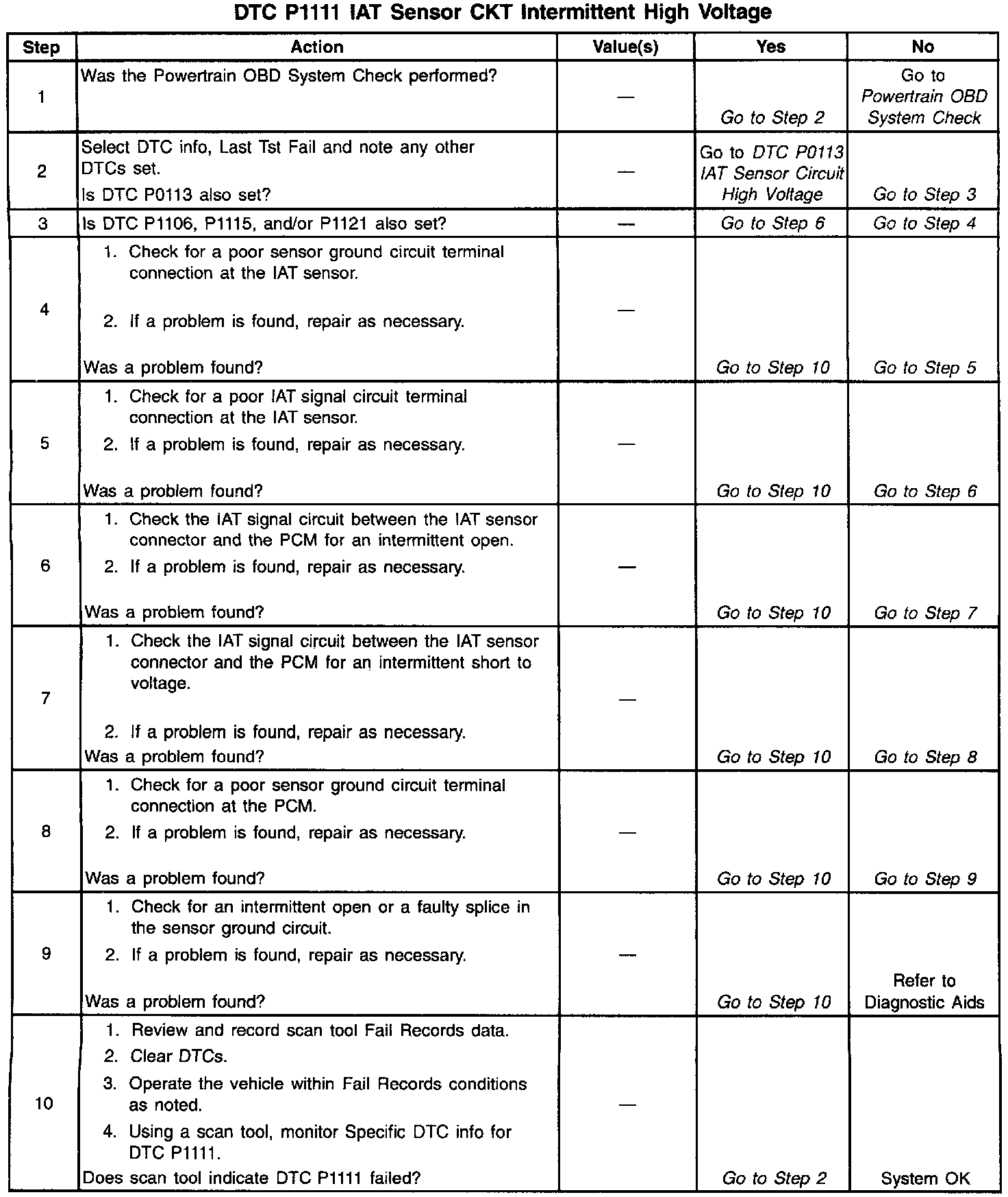 The Intake Air Temperature (IAT) sensor is a thermistor which measures the temperature of the air entering the engine. The PCM applies 5 volts through a pull-up resistor to the IAT sensor. When the intake air is cold, the sensor resistance is high and the PCM will monitor a high signal voltage on the IAT signal circuit. If the intake air is warm, the sensor resistance is lower causing the PCM to monitor a lower voltage. DTC P1111 will set when the PCM detects an intermittently high signal voltage on the intake air temperature sensor signal circuit.