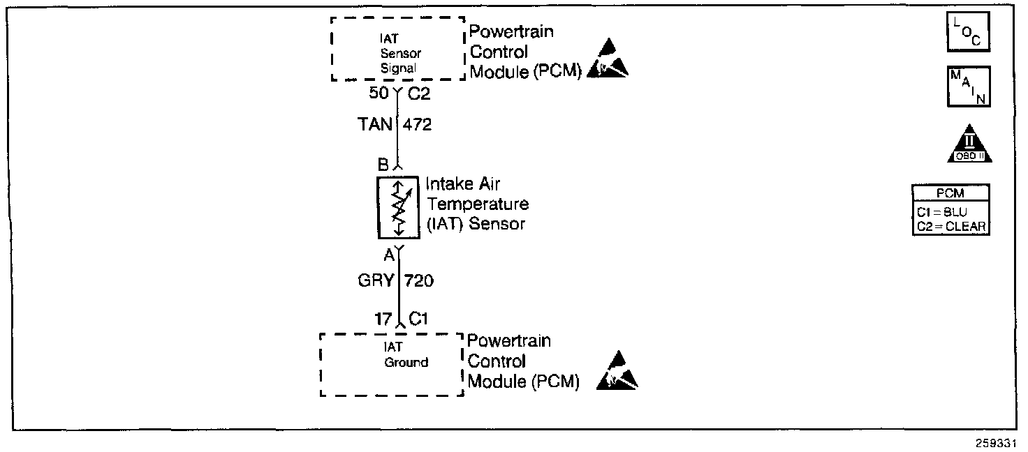 - Damaged harness. Inspect the wiring harness for damage. If the harness appears to be OK, observe the IAT display on the scan tool while moving connectors and wiring harnesses related to the IAT sensor. A change in the IAT display will indicate the location of the fault.