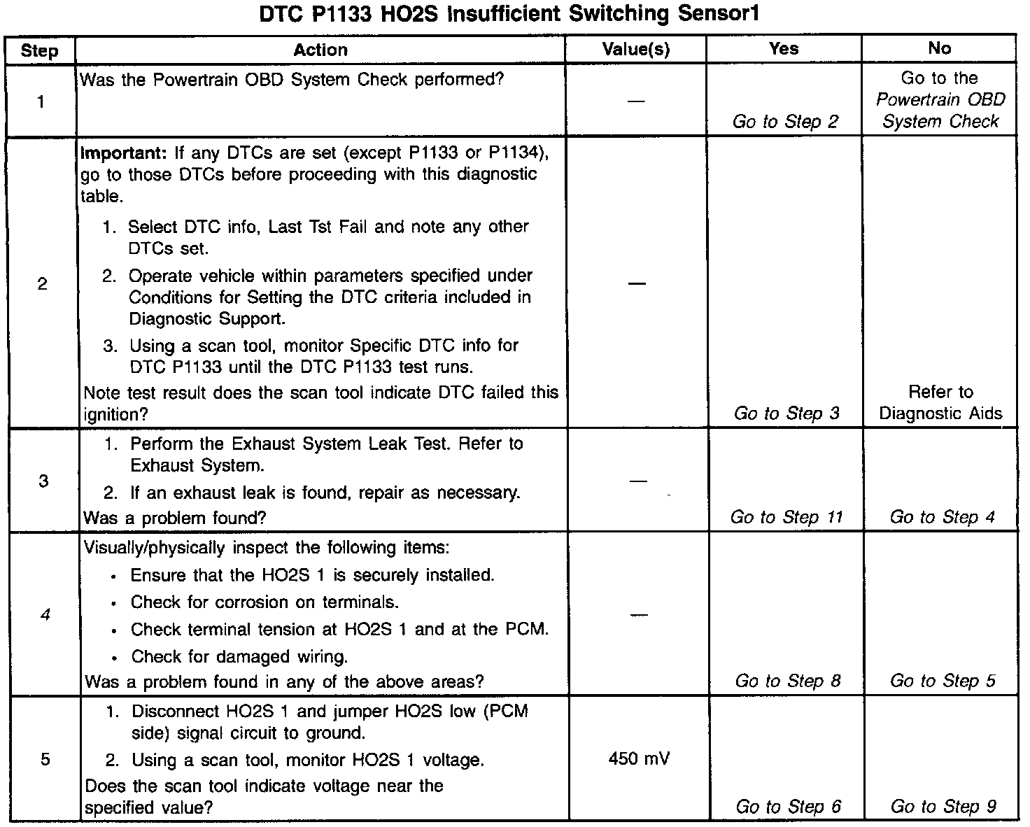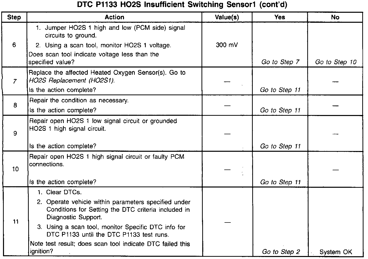 A malfunction in the HO2S heater ignition feed or ground circuit may cause a DTC P1133 to set. Check HO2S heater circuitry for intermittent faults or poor connections. If connections and wiring are OK and DTC P1133 continues to set, replace the HO2S 1. Refer to HO2S Replacement (HO2Sl) HO2S Replacement (H02S2).