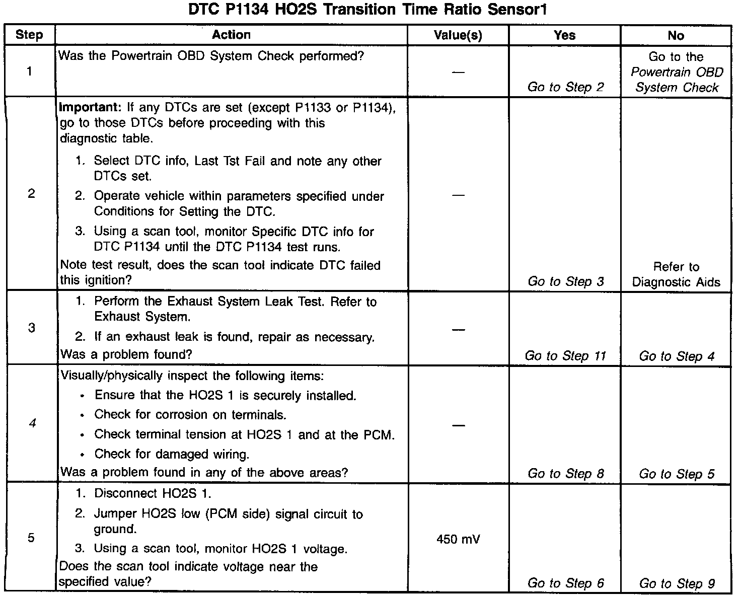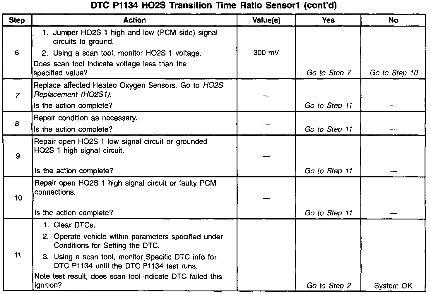 A malfunction in the HO2S heater ignition feed or ground circuit may cause a DTC P1134 to set. Check HO2S heater circuitry for intermittent faults or poor connections. If connections and wiring are OK and DTC P1134 continues to set replace the HO2S 1. Refer to HO2S Replacement (HO2Sl) or HO2S Replacement (H02S2).