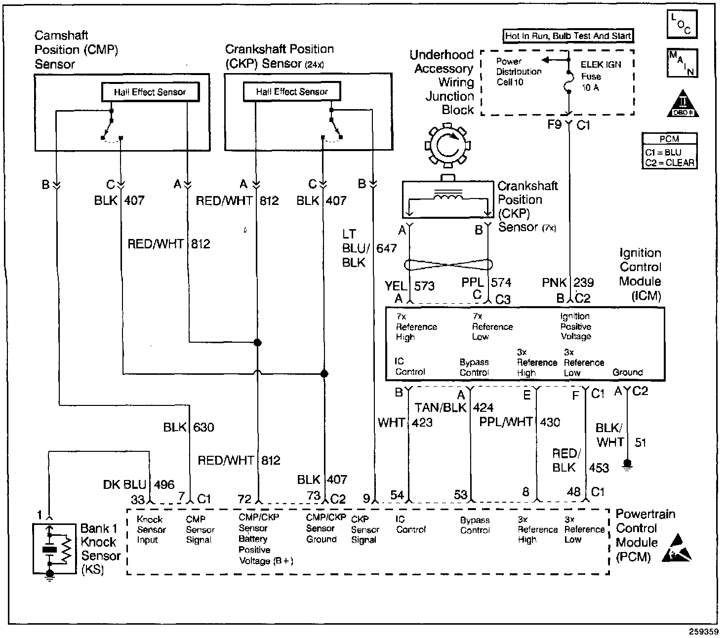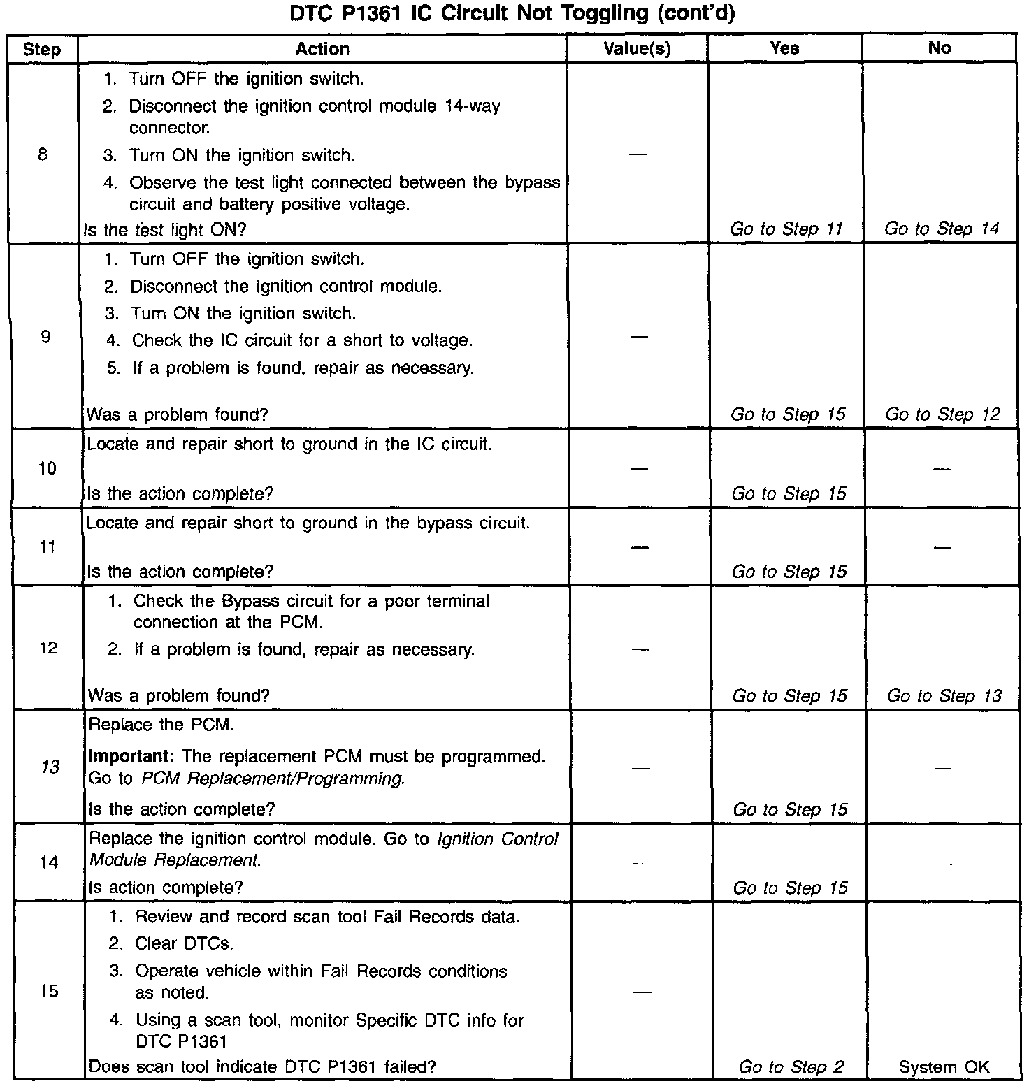 The Ignition Control Module (ICM) sends signals that the PCM requires for fuel control and spark advance calculations. At the start of engine crank, the ICM controls spark advance (Bypass mode). When the second 3X reference pulse is recognized by the PCM, the PCM applies 5 volts to the Bypass circuit. The 5 volts on the Bypass circuit commands the ICM to switch spark advance to PCM control (IC mode). At this time, The ICM will remove the ground it has applied to the IC circuit. When the IC pulses are not grounded, the ICM can use the IC pulses to control spark advance. A short in the IC circuit or an open or short to ground in the Bypass circuit will cause the PCM to monitor no IC pulses after the PCM has switched the Bypass circuit on. The PCM will set DTC P1361 under either of these conditions. The engine may be started but will run on Bypass mode timing.