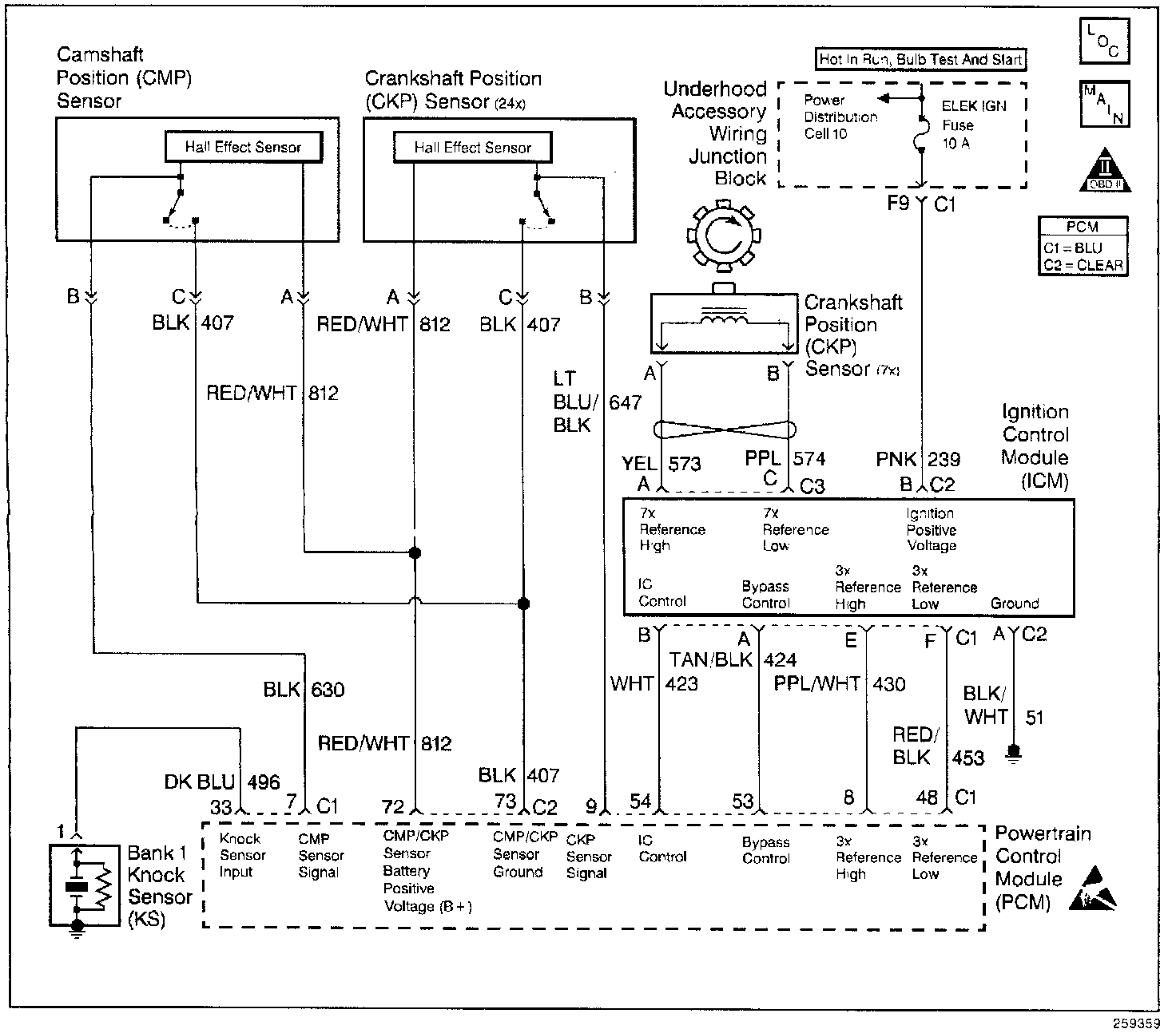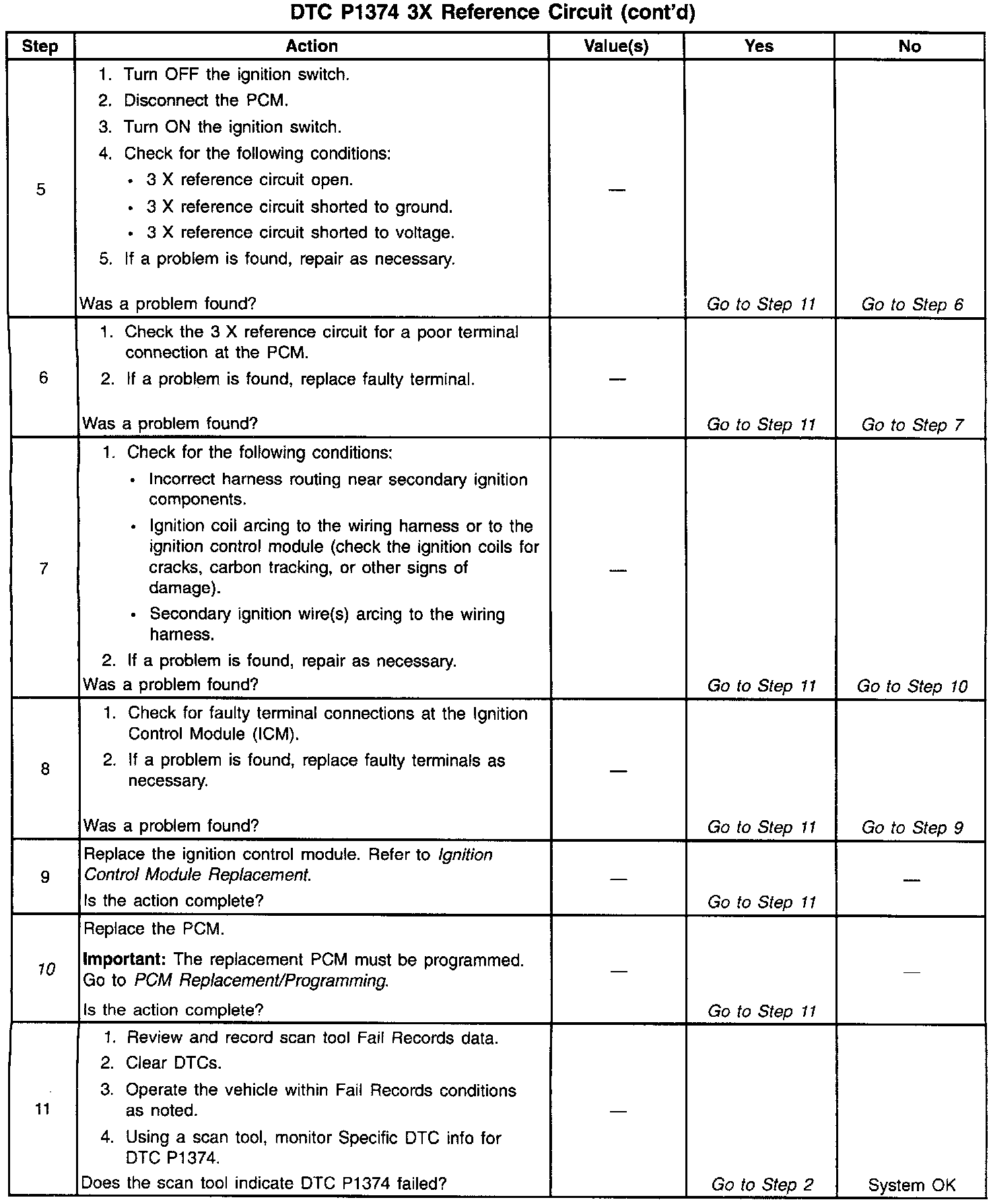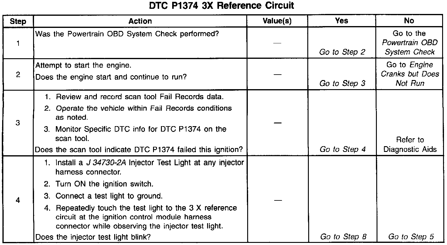 The 3X reference signal is produced by the Ignition Control Module (ICM). The ICM calculates the 3X reference signal by dividing the Crankshaft Position (CKP) sensor 24X pulses by 3 when the engine is running and the CKP synchronizing pulses are being received. The PCM uses the 3X reference signal to calculate the engine RPM and the crankshaft position at engine speeds above 1600 rpm. The PCM also uses these pulses to initiate injector pulses. The PCM compares the 3X reference pulses to the 24X CKP pulses and the CMP pulses. If the PCM receives an incorrect number of pulses on the 3X circuit a DTC P1374 will set and the PCM will use the 24X CKP reference circuit for fuel and ignition control. The engine will continue to start and run using only the 24X CKP and Camshaft Position Sensor signals.