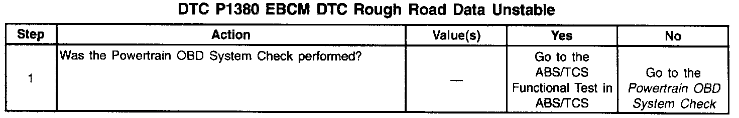 DTC P1380 set indicates that the ABS/TCS system has detected a malfunction which will not allow the EBCM / EBTCM to transmit correct rough road data to the PCM. The Diagnostic System Check in ABS Brakes should be used to diagnose this condition.
