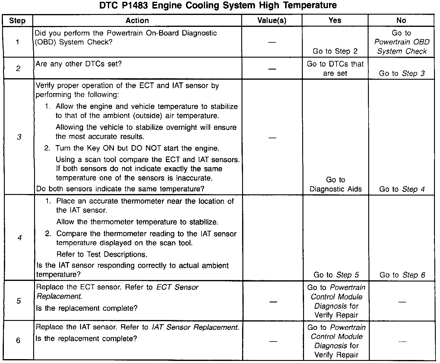 Obtain actual coolant temperature using a thermometer located in the engine coolant. A check of the ECT sensor's resistance may also be performed using the Temperature vs Resistance Specifications table. Refer to Engine Cooling for cooling system precautions and service procedures.