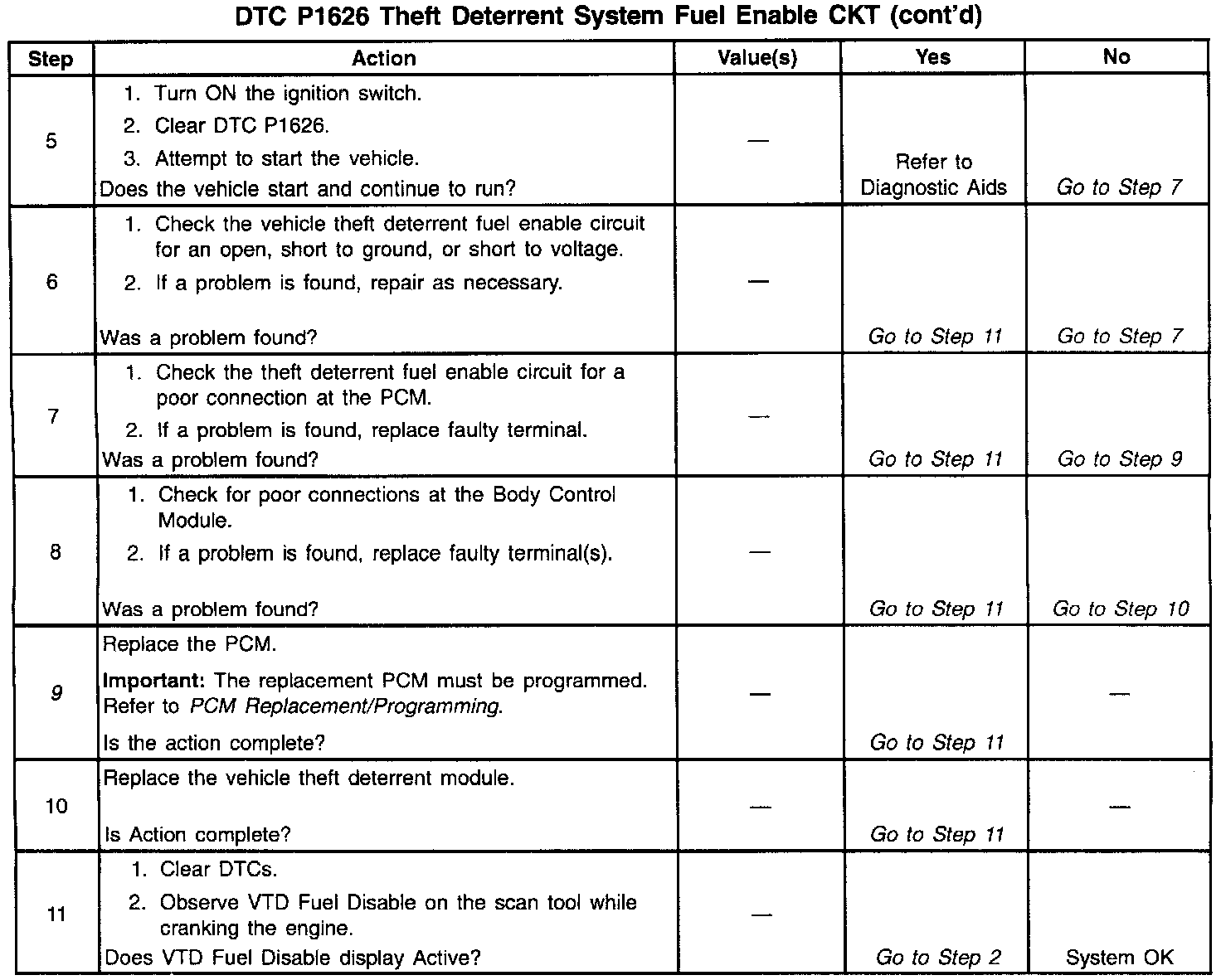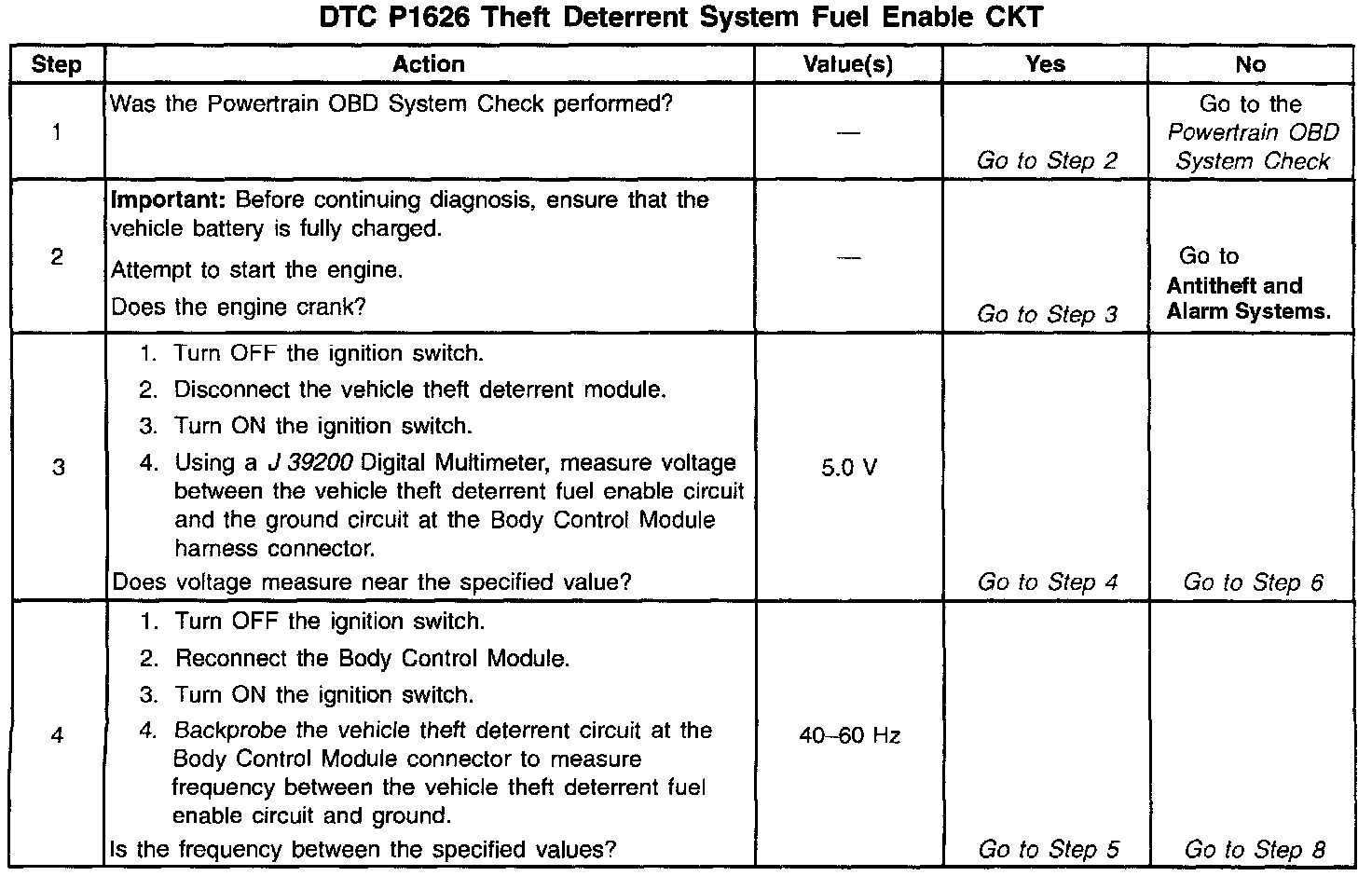 The Vehicle Theft Deterrent module produces the Theft Deterrent Fuel Enable signal when ignition is ON and the proper key resistor pellet is sensed by the Vehicle Theft Deterrent circuit in the Body Control Module. The PCM monitors the Fuel Enable signal during crank. If the proper signal is present on the Theft Deterrent Fuel Enable circuit, the PCM enables fuel delivery to allow the engine to start. If the PCM detects that the fuel enable signal is not present or incorrect while the engine is running, DTC P1626 will be set. The engine will continue to start and run as long as DTC P1626 is stored and the malfunction condition affects only the Theft Deterrent Fuel enable circuit. If the problem affects inputs to the Vehicle Theft Deterrent circuit in the Body Control Module, the starter motor may be disabled. If this condition is present, refer to Vehicle Theft Deterrent System for further diagnosis.