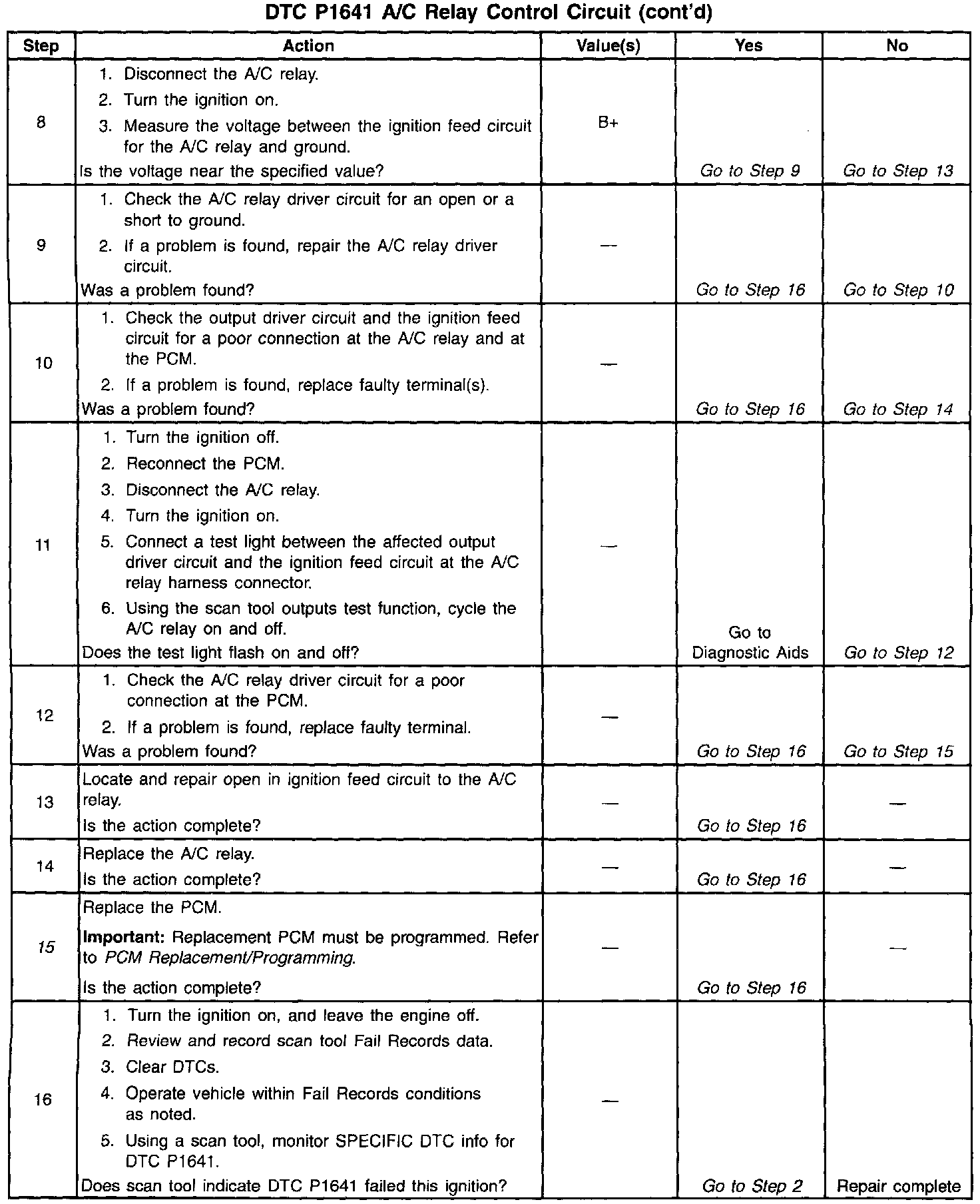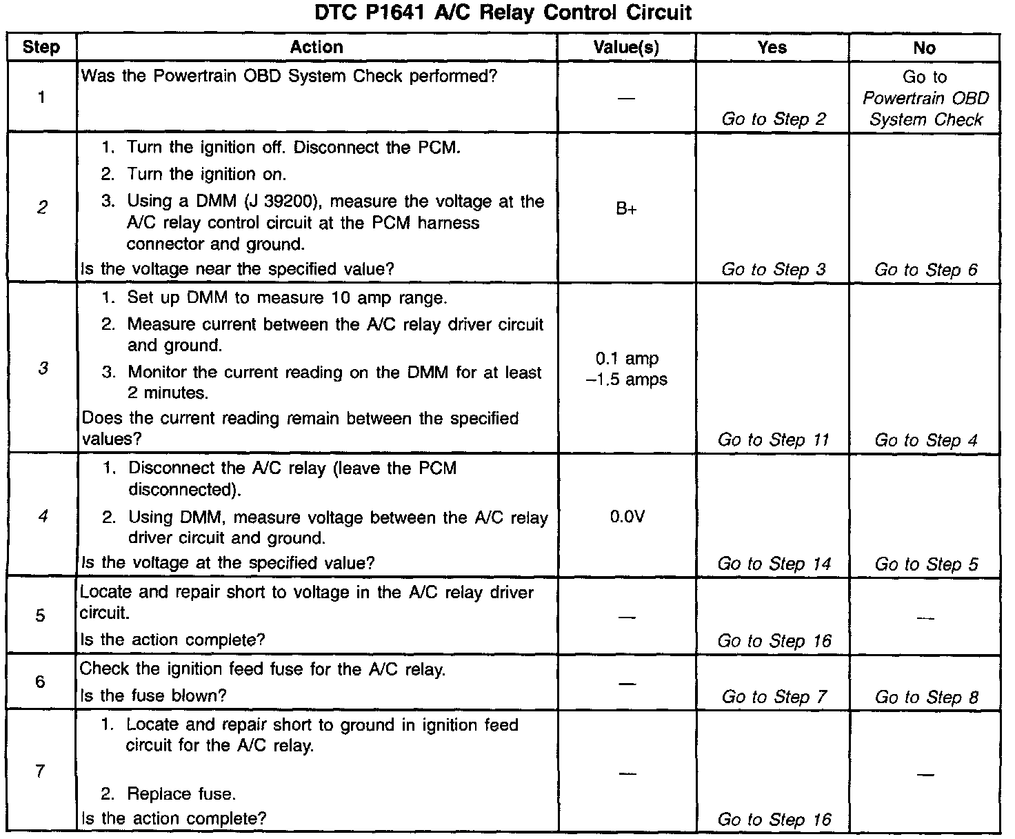 Output Driver Modules (ODMs) are used by the PCM to turn ON many of the current-driven devices that are needed to control various engine and Transaxle functions. Each ODM is capable of controlling up to 7 separate outputs by applying ground to the device which the PCM is commanding ON. DTC P1641 set indicates an improper voltage level has been detected on the output circuit which controls the A/C compressor control relay.