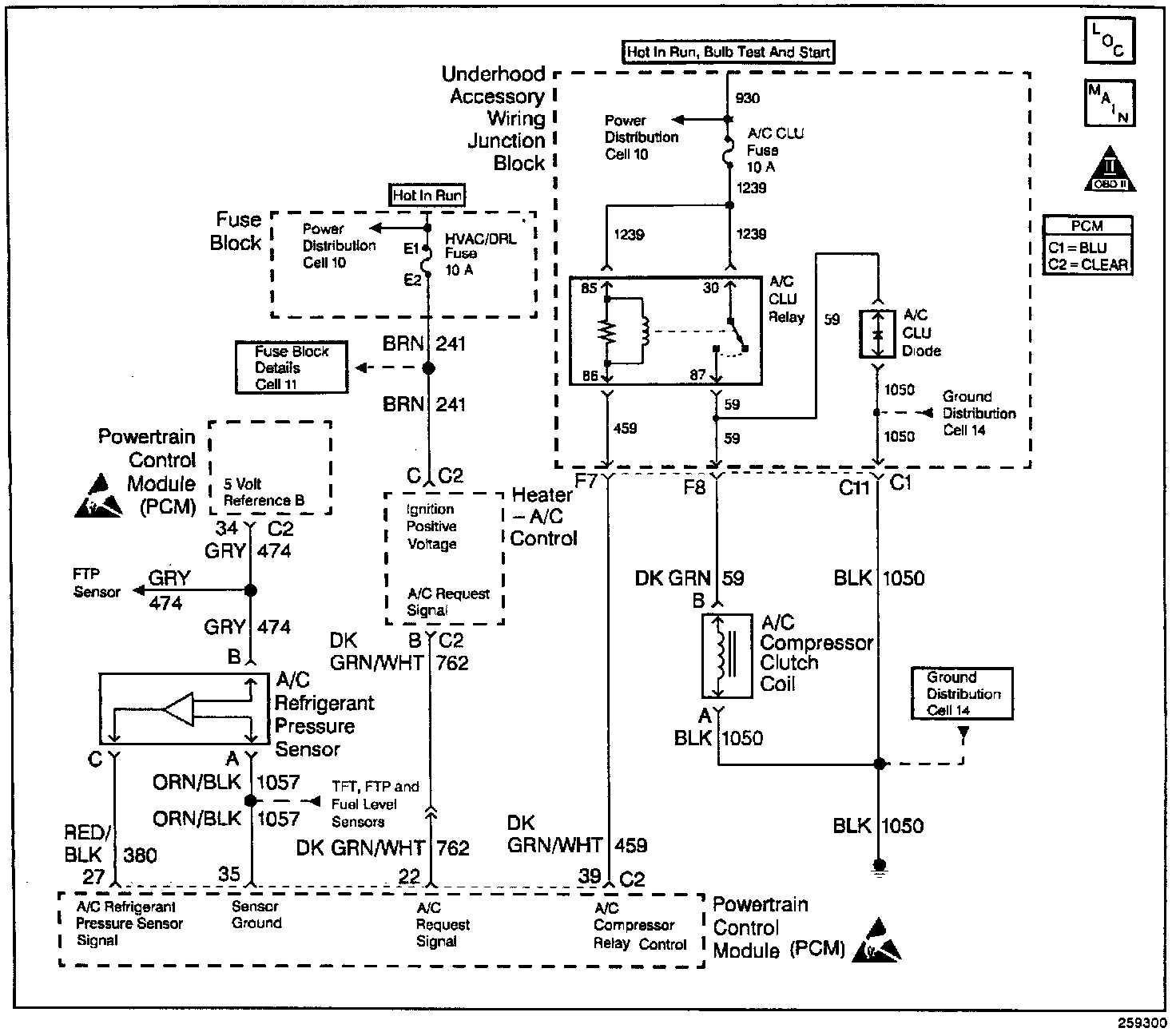- An improper voltage level has been detected on the output circuit which controls the A/C compressor control relay.
