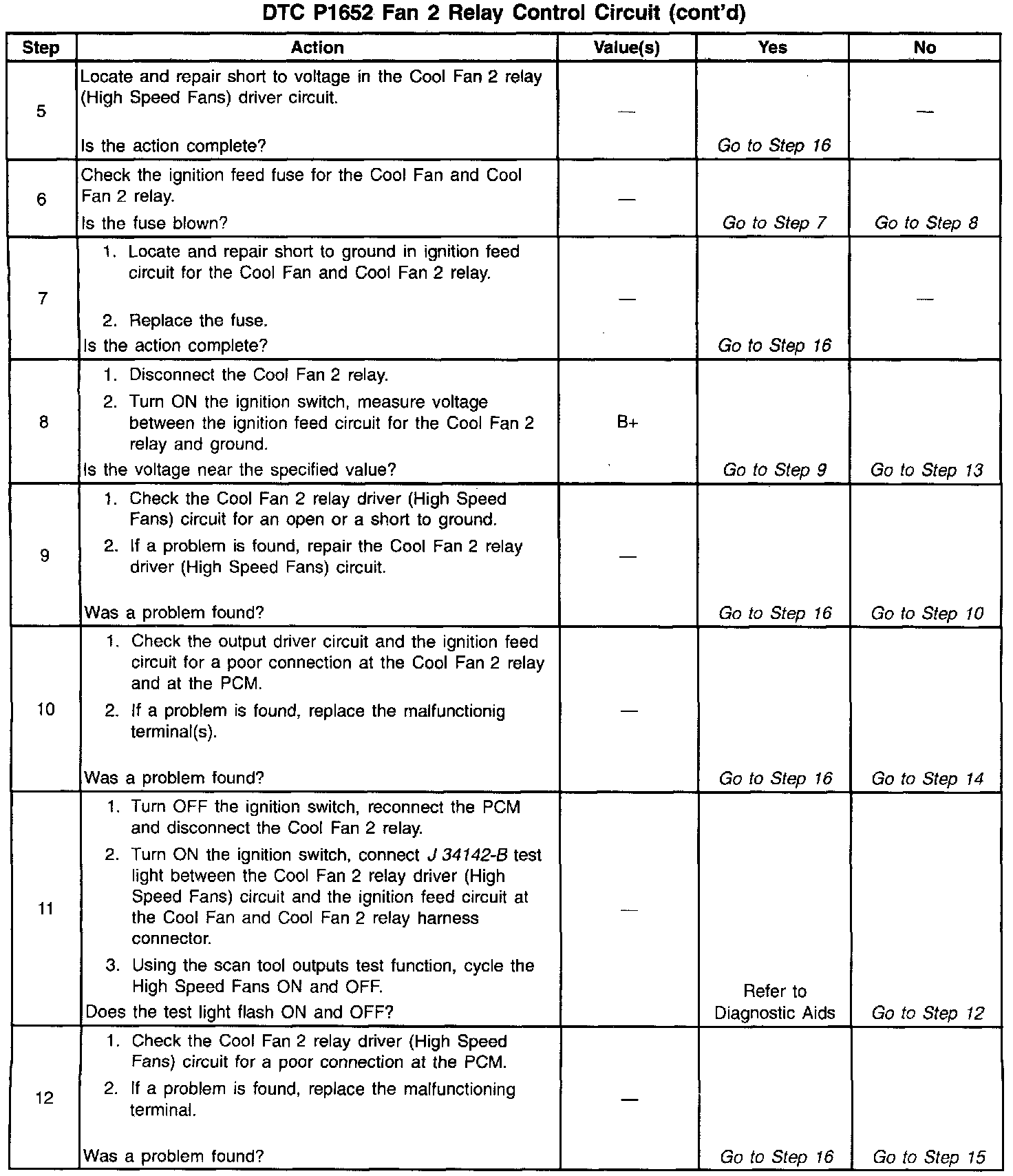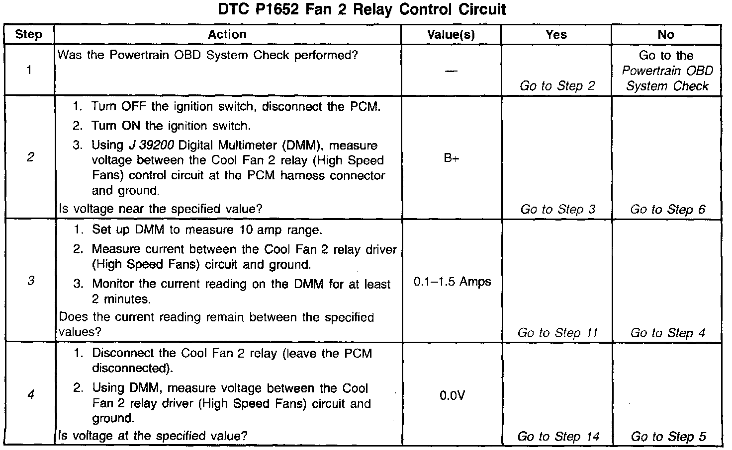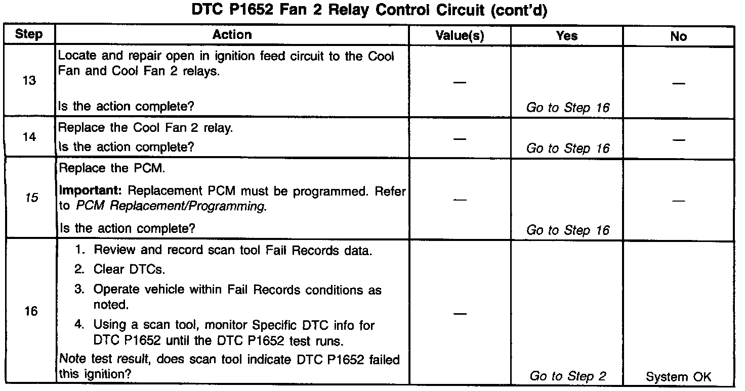 Output Driver Modules (ODMs) are used by the PCM to turn on many of the current-driven devices that are needed to control various engine and Transaxle functions. Each ODM is capable of controlling up to 7 separate outputs by applying ground to the device which the PCM is commanding on. Unlike the Quad Driver Modules (QDMs) used in prior model years, ODMs have the capability of diagnosing each output circuit individually. DTC P1652 set indicates an improper voltage level has been detected on ODM B output 2, which controls the High Speed Fans (Cool Fan and Cool Fan 2 relays).