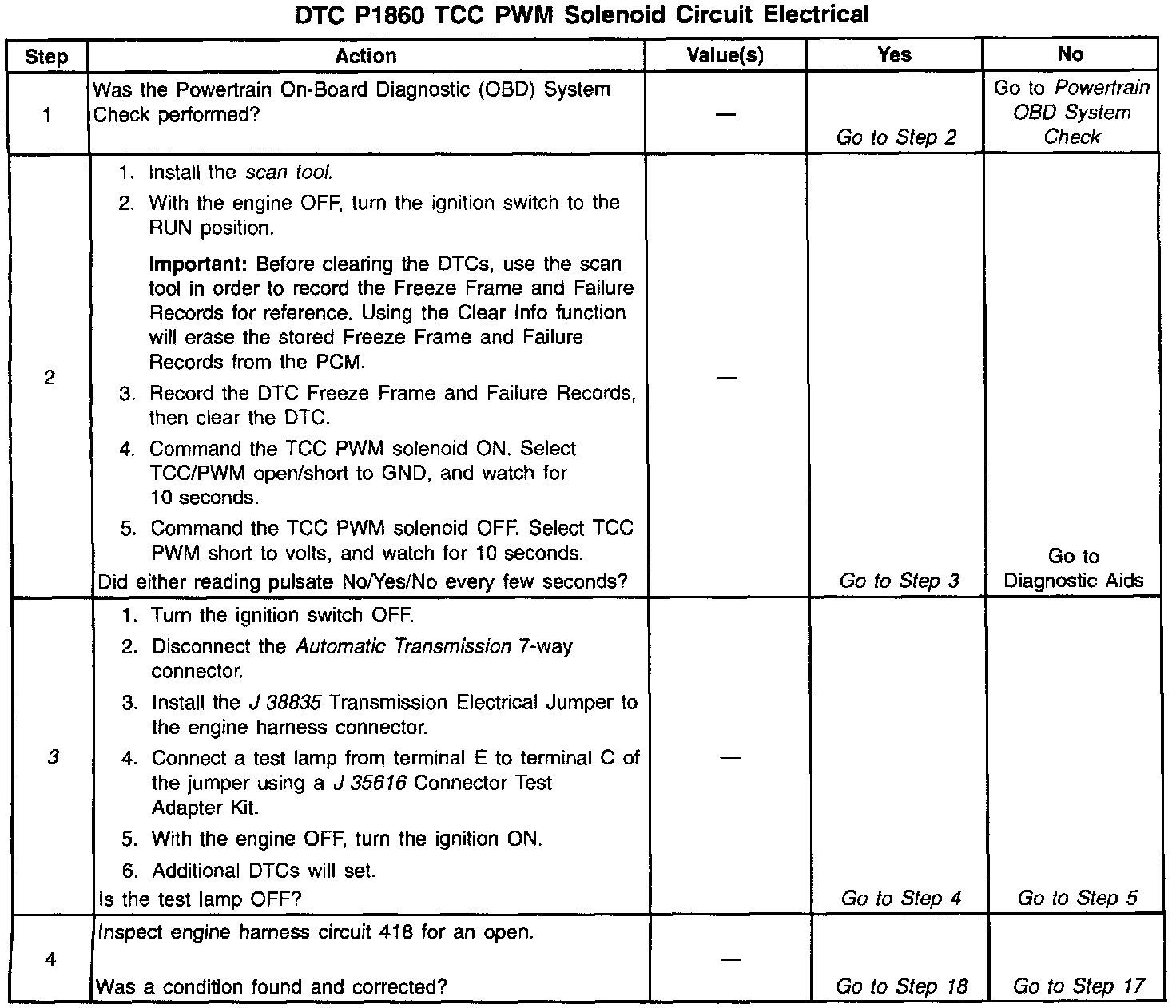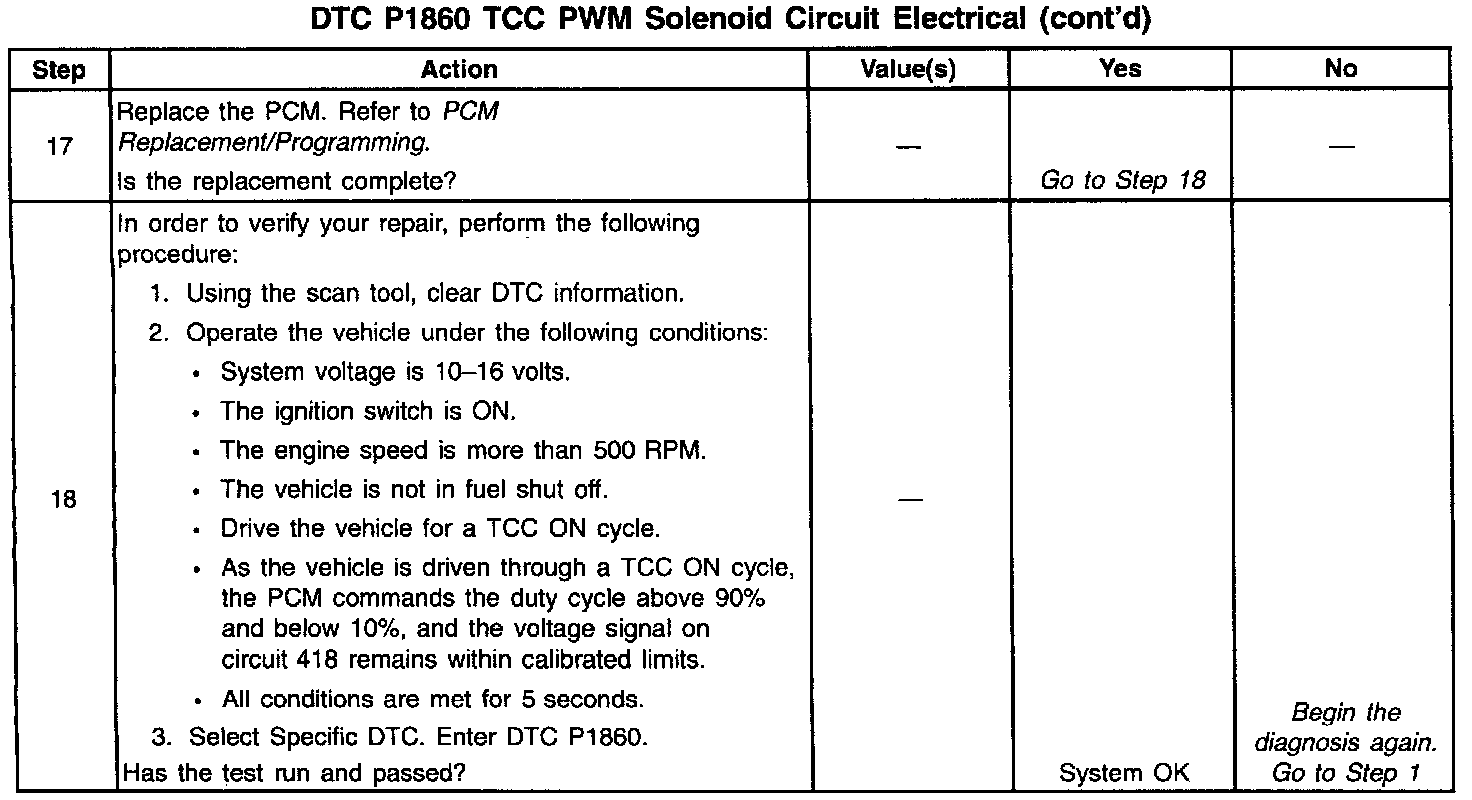 When the PCM detects a continuous open or short to ground in the TCC PWM circuit then DTC P1860 sets. DTC P1860 is a type A DTC.