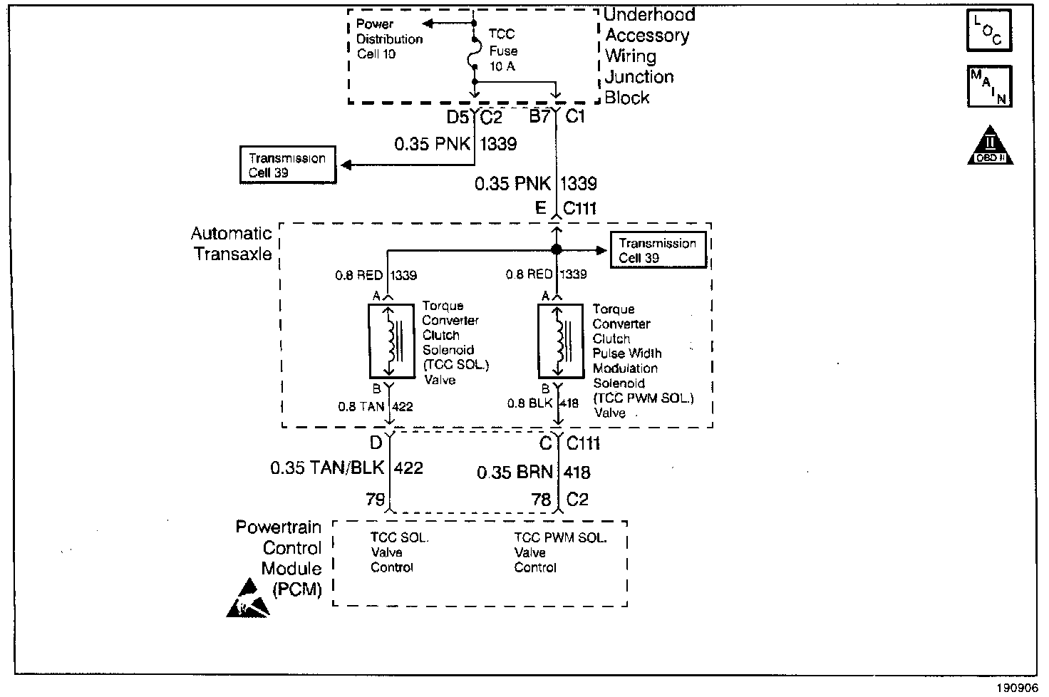 Ignition voltage is applied through circuit 1339 to the TCC PWM solenoid. The Output Driver Module (ODM), within the PCM provides the ground path for the circuit.