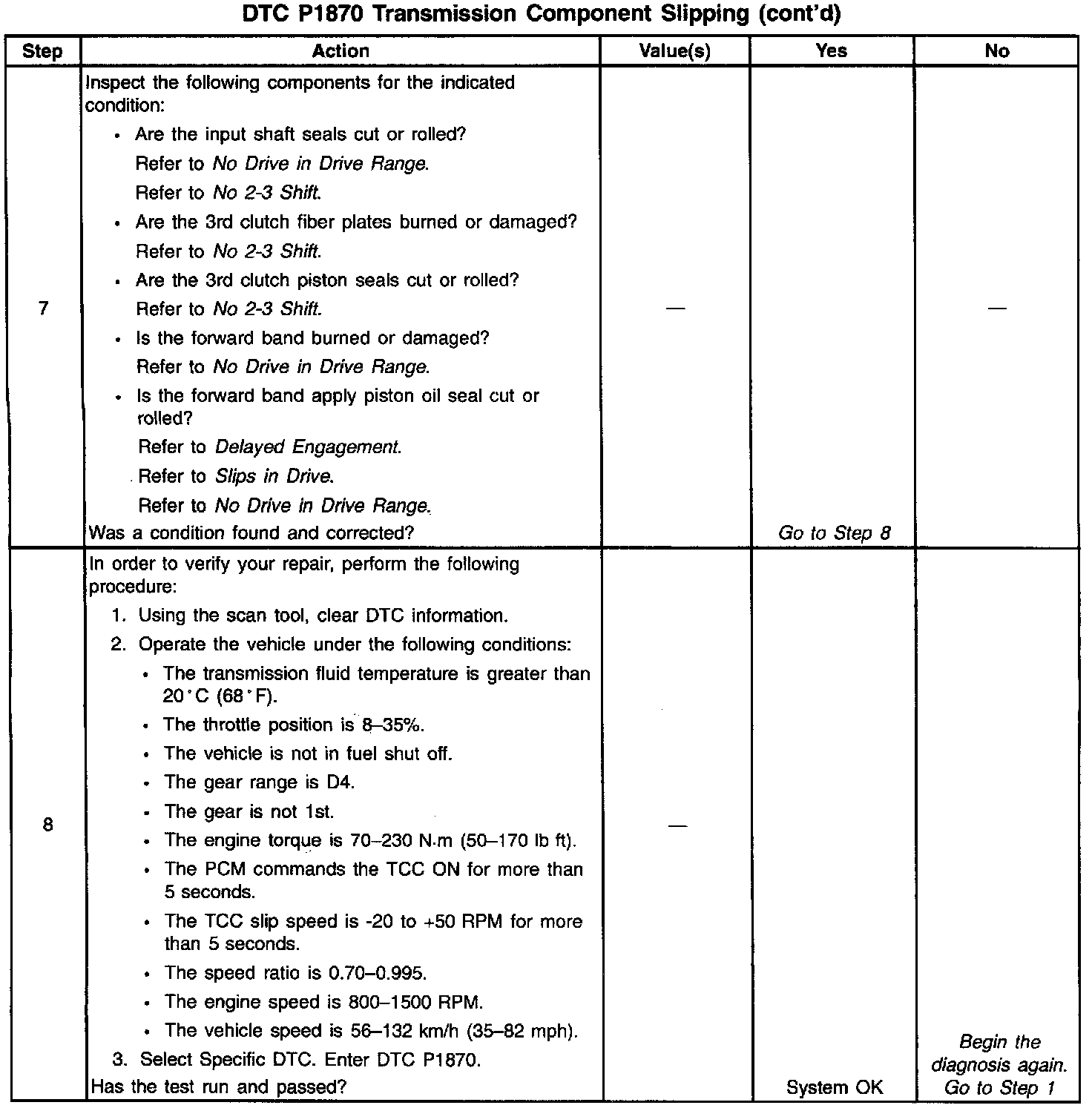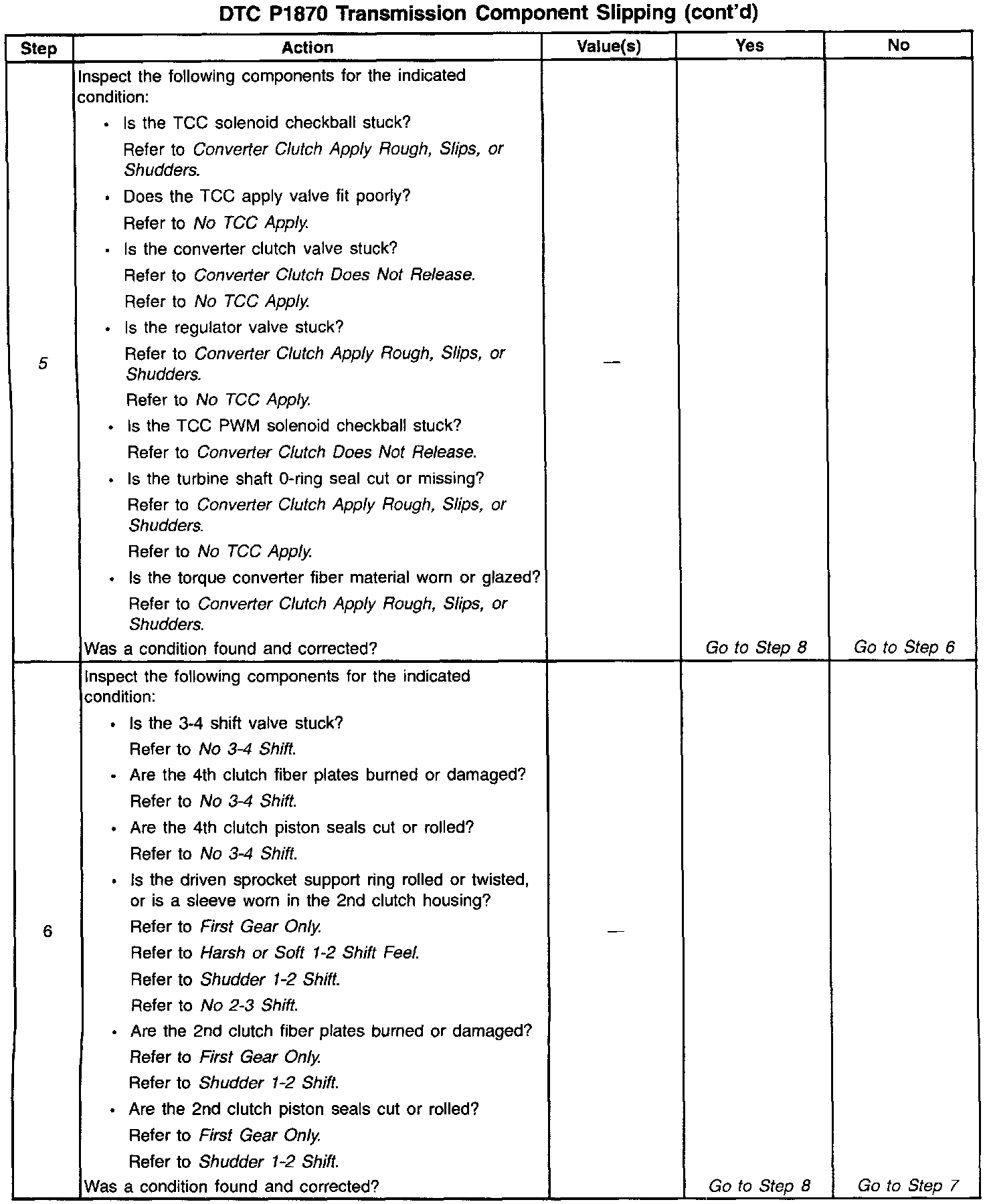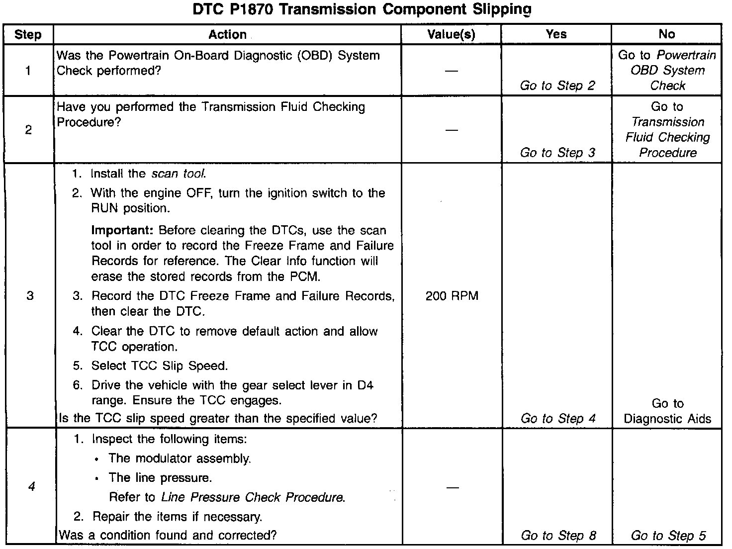 When the PCM detects an excessive amount of slip when the TCC is engaged, then DTC P1870 sets. DTC P1870 is a type B DTC.