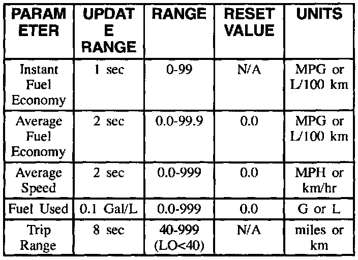 The driver information display shall calculate and display the following vehicle parameters: Average Fuel Economy, Instant Fuel Economy, Trip Range, Fuel Used, and Average Speed. Only one of the above parameters will be displayed at a time. The user can change the parameter displayed by depressing the MODE button located on the display face. The operator can change the display units from English to Metric by pressing the E/M button on the display face. The Driver Information Display shall perform error detection where possible (no serial data stream for 10 seconds or an open circuited fuel level sender). If the driver information display is unable to calculate a value due to a missing speed signal, it shall display an E when any of the following functions are selected: AVG ECON, INST ECON, AVG SPEED. In the absence of vehicle communications, the driver information display will display a double dash - in the digits section. The display format for each mode is indicated below.