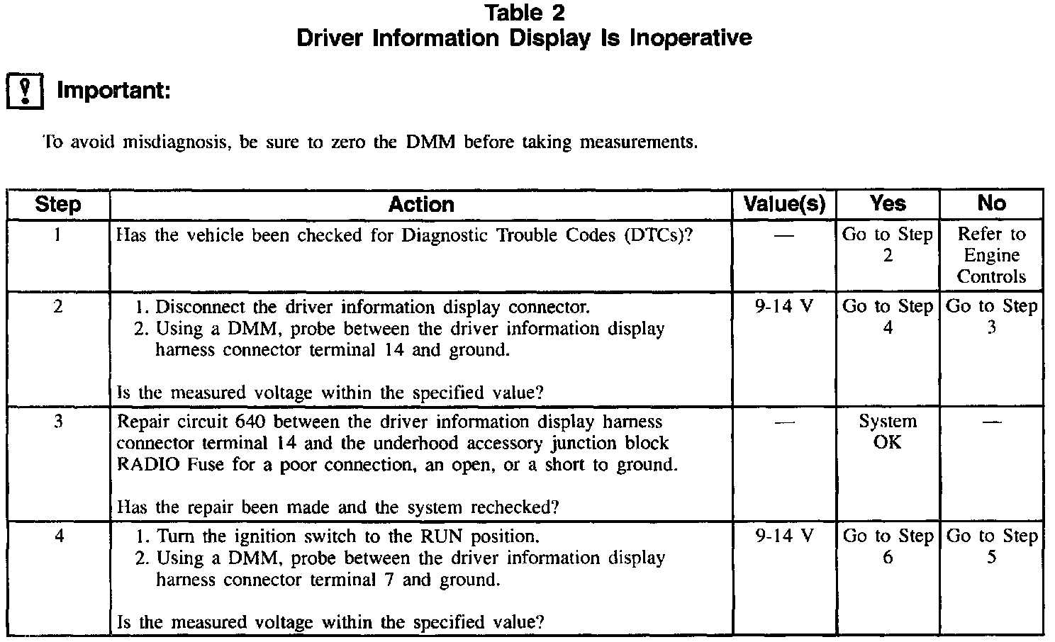 Table 2: Driver Information Display Is Inoperative