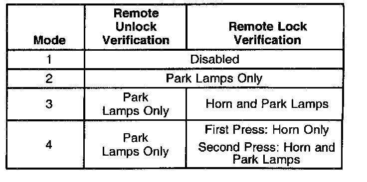The seat belt telltale will flash and the chime will sound 1-2 time in order to indicate which remote unlock control mode the BCM is in. Each time the transmitter LOCK button is pressed, the mode number will advance. A transition past mode 4 will start over again at mode 1.