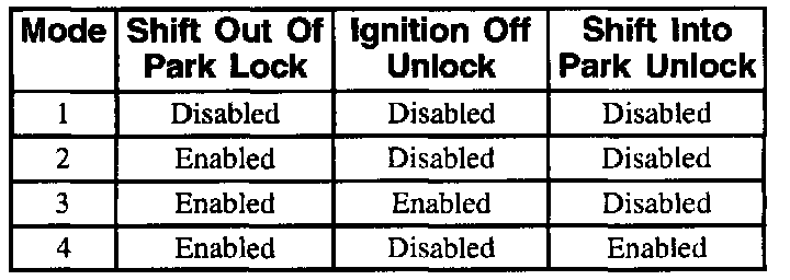 - Shift out of PARK lock enabled (modes 2, 3 and 4): Locks all doors when shifting the transaxle out of PARK with the driver's door closed.