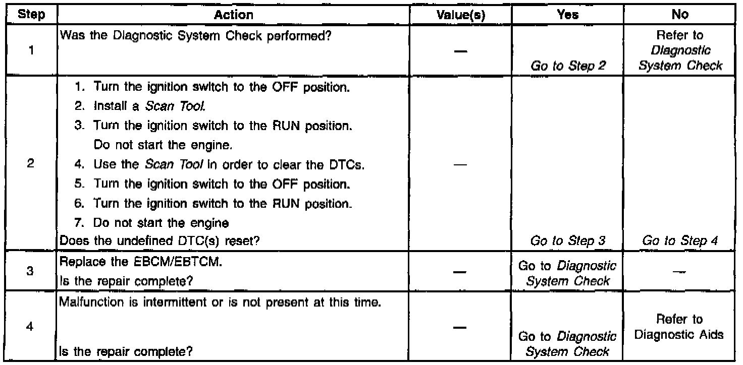 This symptom table identifies undefined DTCs which result from an internal malfunction in the EBCM/EBTCM.
