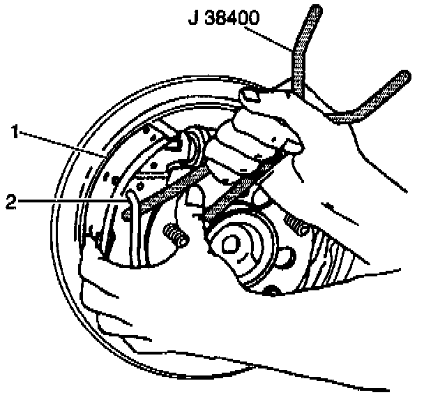 9. Use the J 38400 in order to pull the end of the return spring (2) over until it snaps into the slot in the brake shoe.