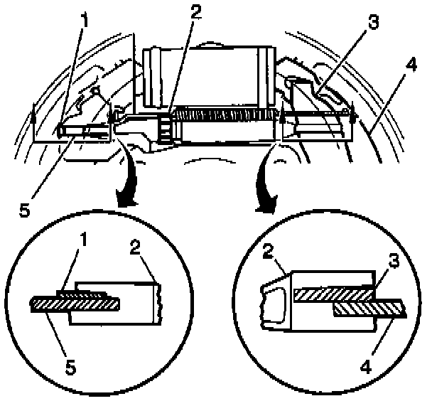 7. Install the adjuster screw (2) and the adjuster shoe and lining (4 and 5).