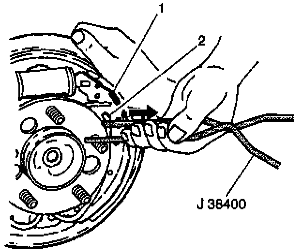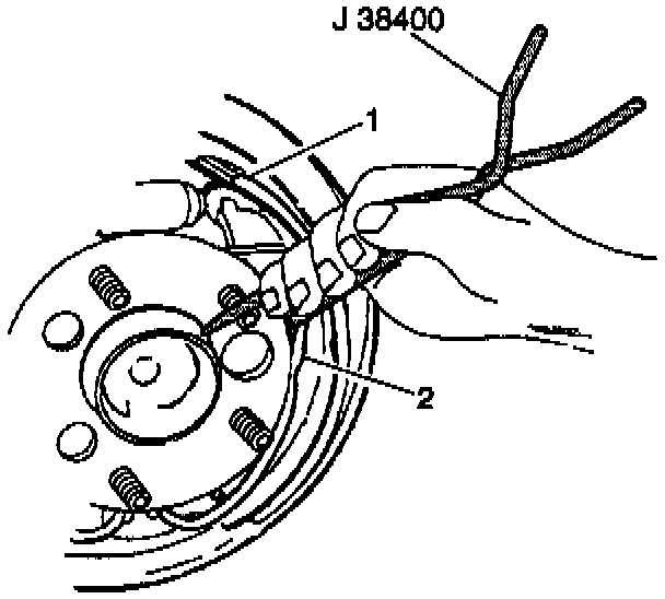 8. install the return spring (2) into the adjuster shoe and lining (1). Use the J 38400 in order to pull the end of the return spring up (2) and rest the return spring on the web of the brake shoe.
