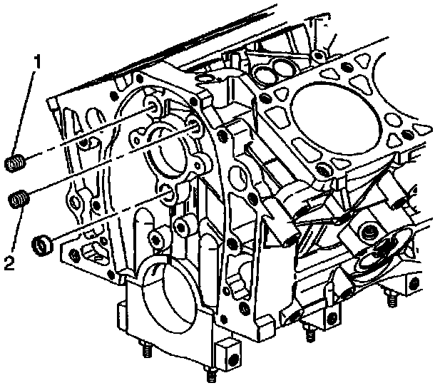 13. Install the front 1/8 inch oil gallery plugs (1,2).