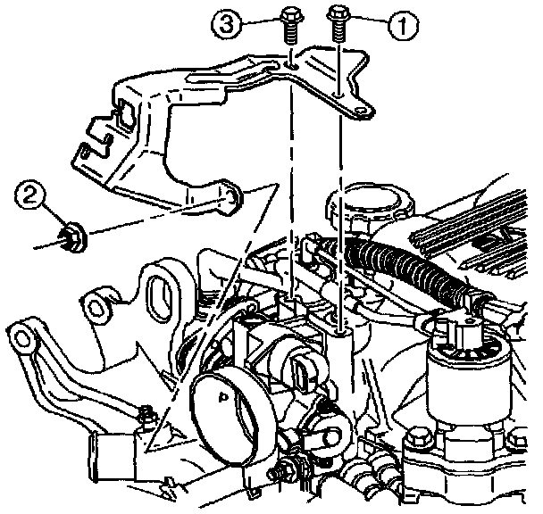 1. Remove the accelerator control cable bracket bolts and nut (1), (2), and (3).
