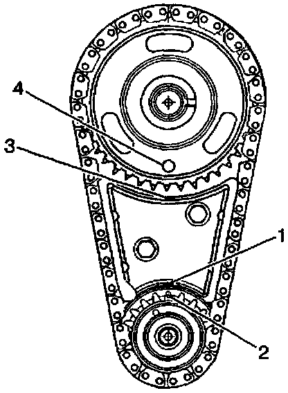 7. Align the timing mark on the camshaft gear (4) with the timing mark on top of the timing chain dampener (3).