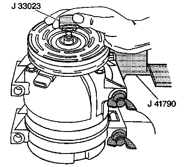 Make sure the clutch coil and the J 33024 stay in-line with each other while pressing the clutch coil onto the compressor.