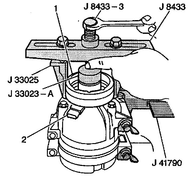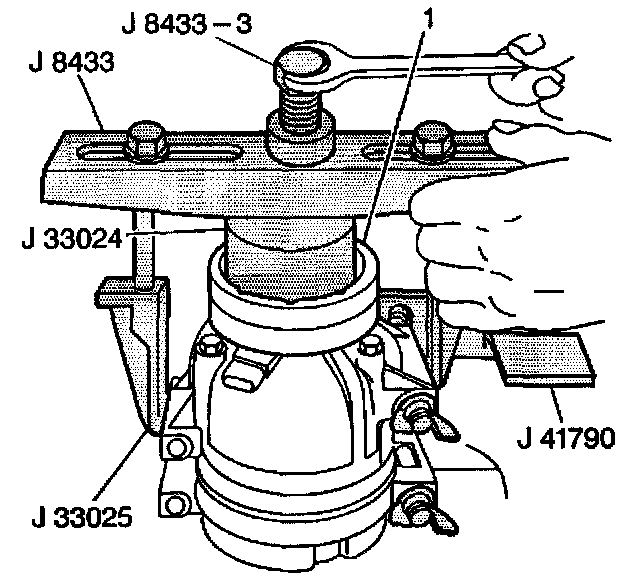 7. Install the J 8433 onto the compressor clutch coil (1) and tighten the puller leg bolts.