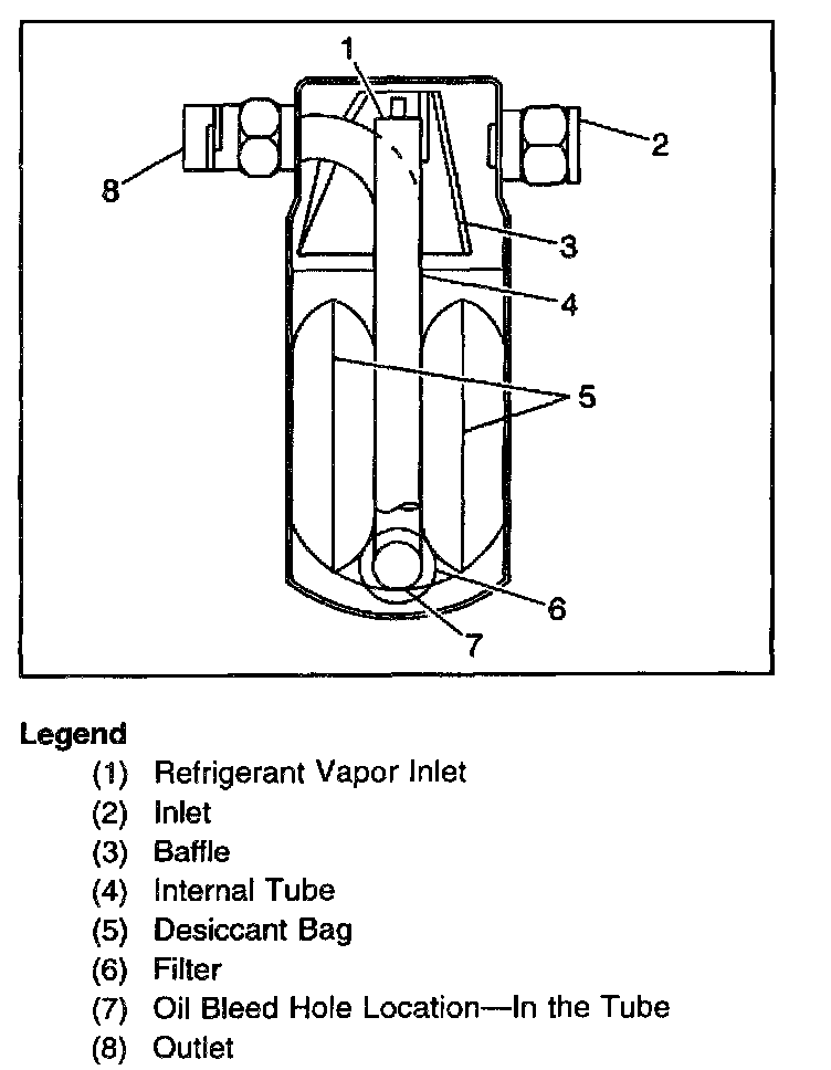 The sealed accumulator is connected to the evaporator outlet pipe. The accumulator stores the refrigerant (vapor and liquid) and the oil from the evaporator. A desiccant at the accumulator bottom dries any moisture in the system. An oil bleed hole at the accumulator outlet pipe end provides the oil return path to the compressor. The accumulator is not serviceable and should only be replaced when leaking due to the following conditions: