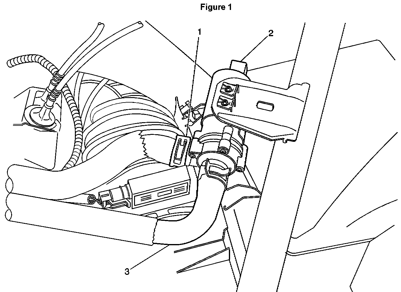 15. Attach the ambient Air Temperature Sensor (ATS), P/N 10407728, to the back side of the bumper bar in the approximate location shown in Figure 3. Routing of the harness from the left to the right side of the vehicle should follow the cross car engine harness that is located just behind/below the hood latch mechanism (illustration is only for locating sensor position).