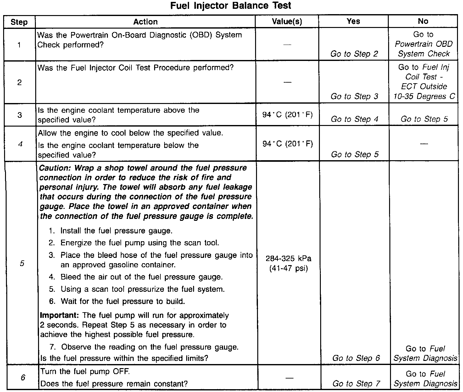 6. The fuel pressure should reach a steady value. If the fuel pressure does not reach a steady value, go to Fuel System Diagnosis. System Diagnosis - Fuel System