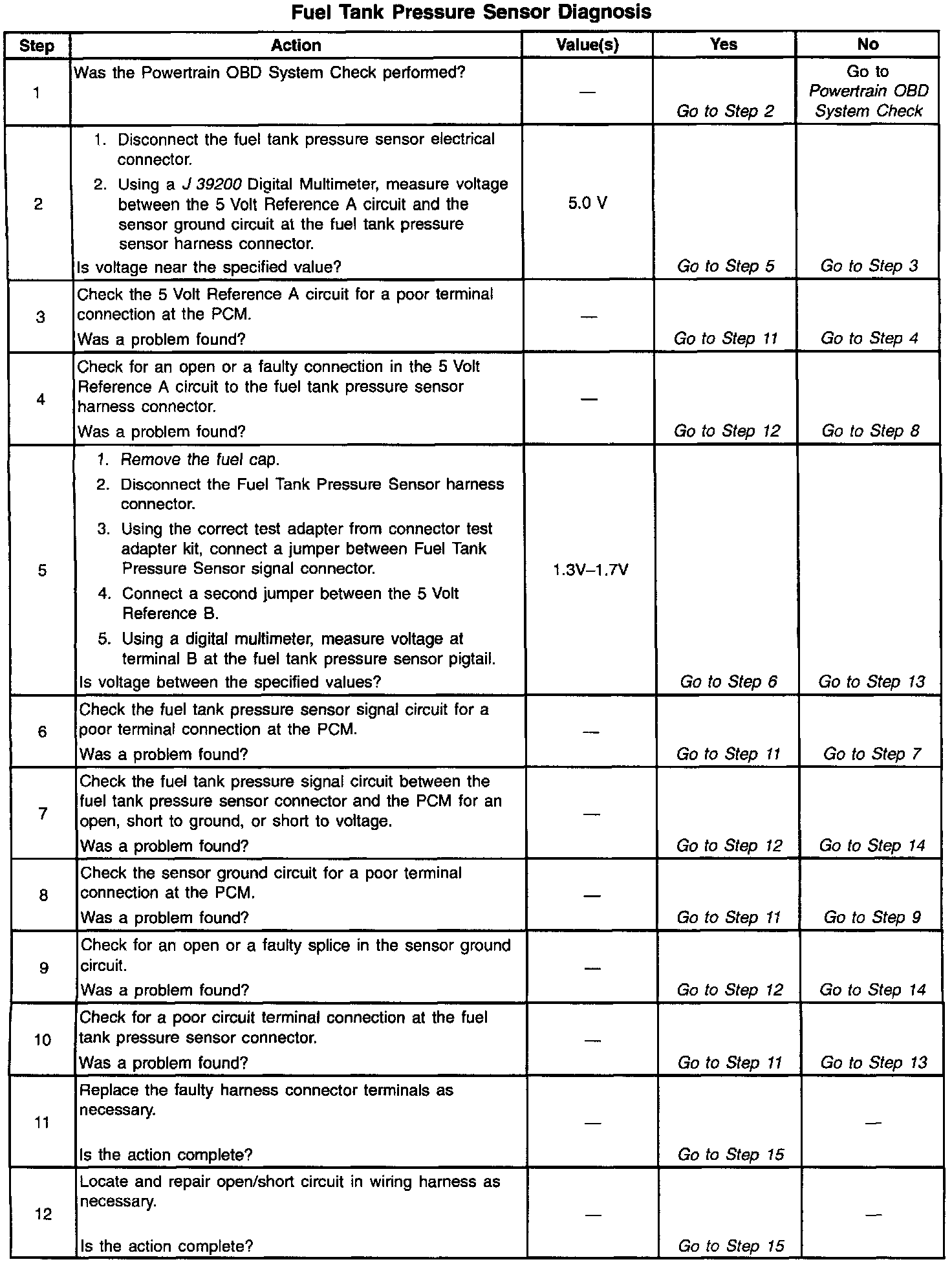 The Fuel Tank Pressure Sensor Diagnosis table is intended to isolate and diagnose electrical problems with the sensor wiring or the sensor.
