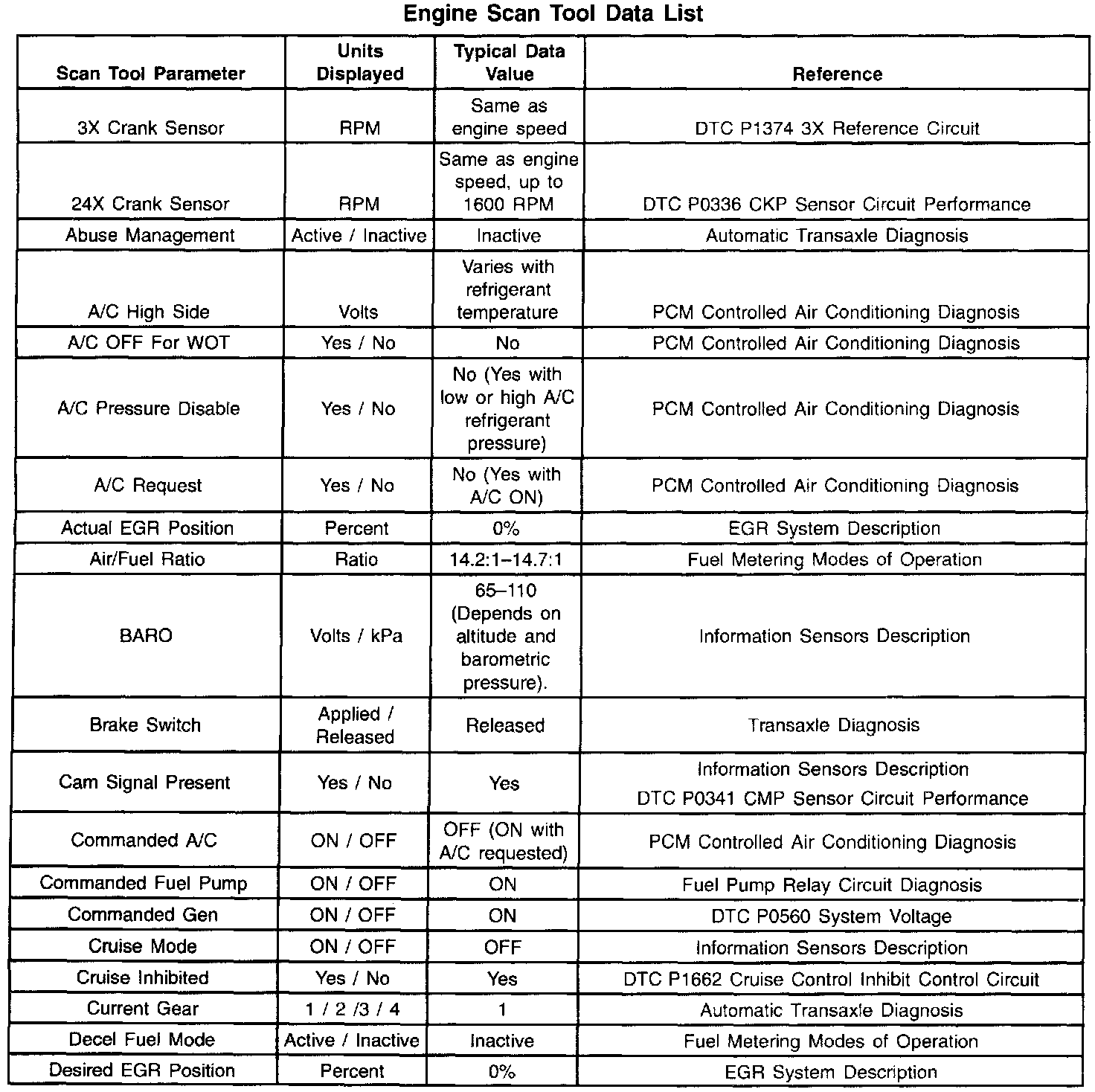 Use only the parameters listed in the tables for diagnosis. If a scan tool reads other parameters, the values are not recommended by General Motors for use in diagnosis.