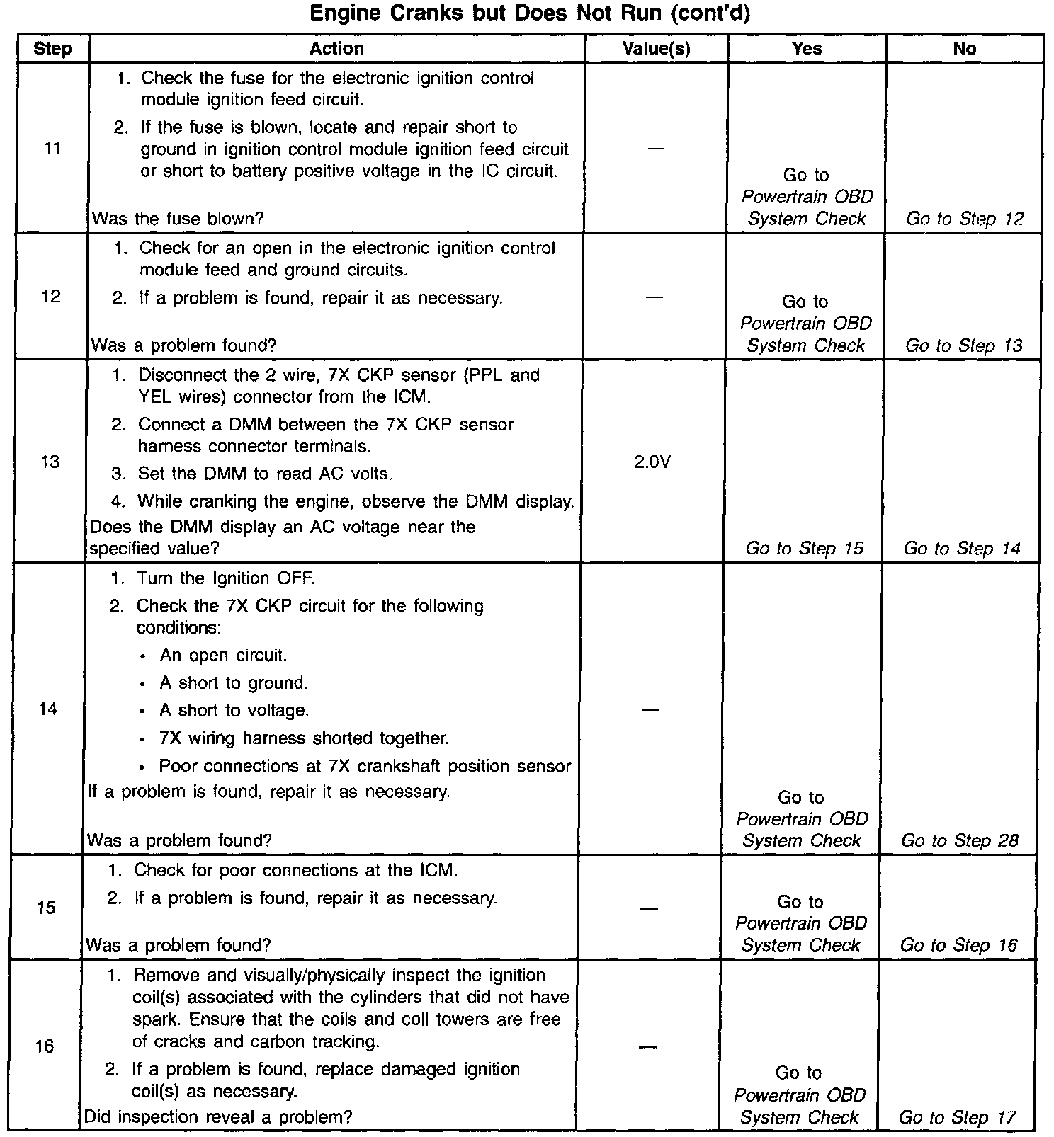 During cranking, the ignition control module monitors the 7X crankshaft position sensor input for recognition of the sync signal. The sync signal is used to determine the correct cylinder pair to spark first. After the sync signal has been processed by the ignition control module, it sends a 3X reference signal to the PCM. The sync signal is used only by the ignition control module. It is used for spark synchronization at start-up only (not passed to the PCM).