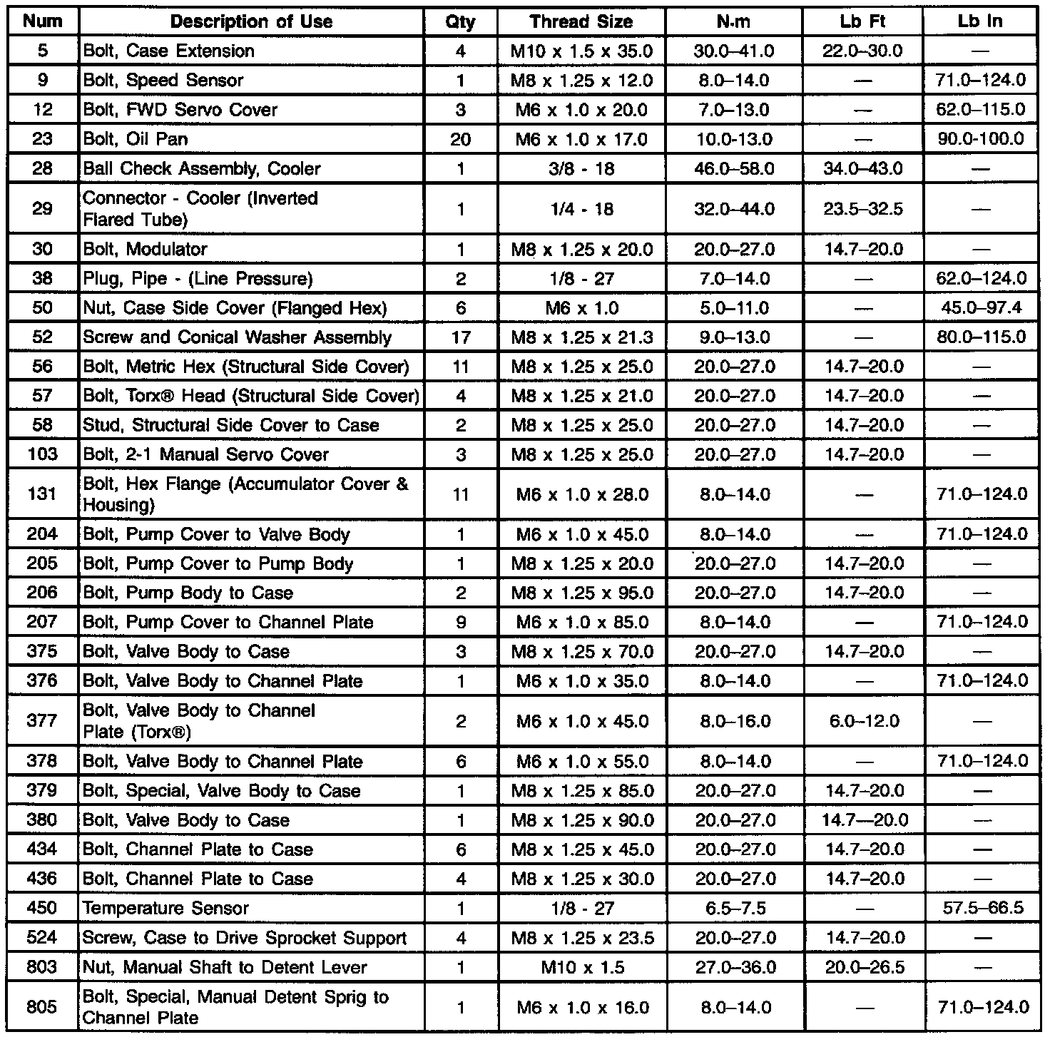 For visual identification of the bolt/nut in the chart, match the number in the "NUM" column with the number in the legend of the transmission exploded view under Diagrams/Exploded Views.