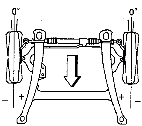 Toe is the measurement of how much the fronts of the wheels are turned in or out from a straight-ahead position. When the wheels are turned in, the toe is positive (+). When the wheels are turned out, the toe is negative (-). The actual amount of toe is normally only a fraction of a degree. The purpose of toe is to ensure that the wheels roll parallel. Toe also serves to offset the small deflections of the wheel support system which occur when the vehicle is rolling forward. Incorrect toe-in or incorrect toe-out will cause tire wear and less than optimum economy. As the suspension and steering systems wear with extensive vehicle mileage, additional toe will be needed in order to compensate. Correct the toe dimension last.