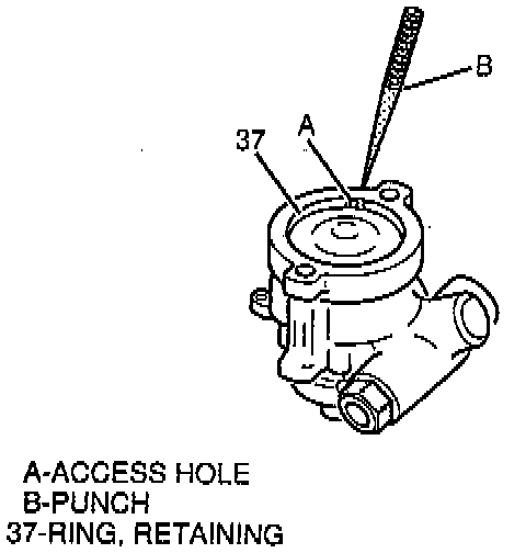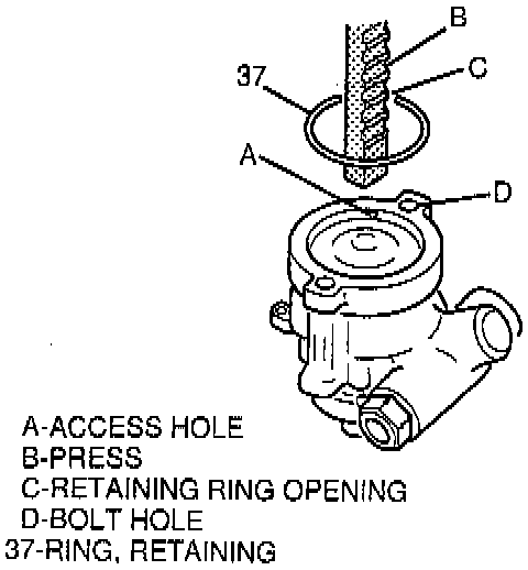 14. Retaining ring (37) into groove in pump housing (10), with ring opening near access hole in pump housing.