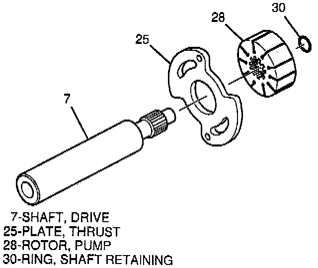 8. Shaft retaining ring (30) from drive shaft (7). Pump rotor (28) and thrust plate (25) from drive shaft (7).