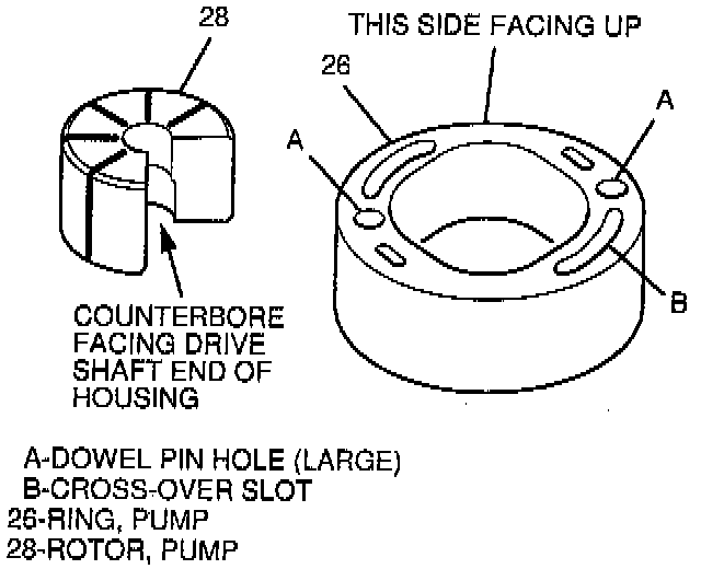 7. Pump ring (26), with holes positioned correctly onto dowel pins (6), in pump housing (10).