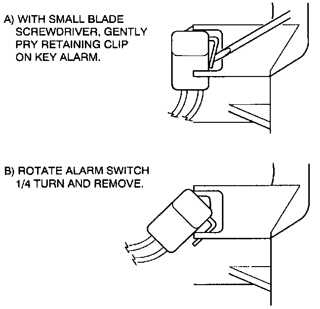 ^ Gently pry retaining clip on alarm switch with small blade screwdriver.