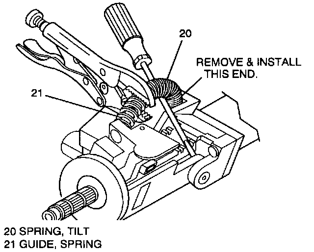 CAUTION: The tilt spring (20) and spring guide (21) are under pressure and could become a projectile. During removal and installation secure spring with locking pliers. Exercise caution when removing or installing spring and guide, as bodily injury may result.