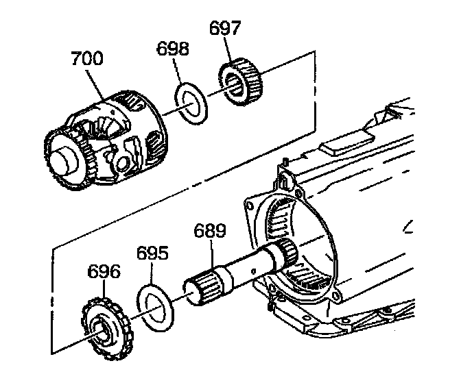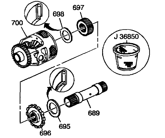 1. Assemble the sun gear thrust bearing (698), the differential carrier sun gear (697), the park gear (696), the internal gear thrust bearing (695) and the sun gear shaft (689) into the differential carrier (700).